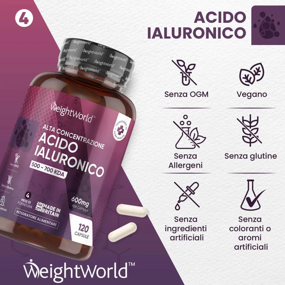 Le capsule di acido ialuronico di WeightWorld sono progettate per supportare articolazioni, ossa e pelle dall'interno. Con l'età e l'usura, i livelli naturali di acido ialuronico nei nostri corpi iniziano purtroppo a diminuire, causando articolazioni rigide, ossa fragili e pelle secca e invecchiata. Per aiutare a combattere questi problemi, le capsule lavorano aumentando i livelli naturali di acido ialuronico del corpo, aiutandoti così a muoverti con maggiore facilità e a sentire la pelle più fresca, liscia e giovane.
