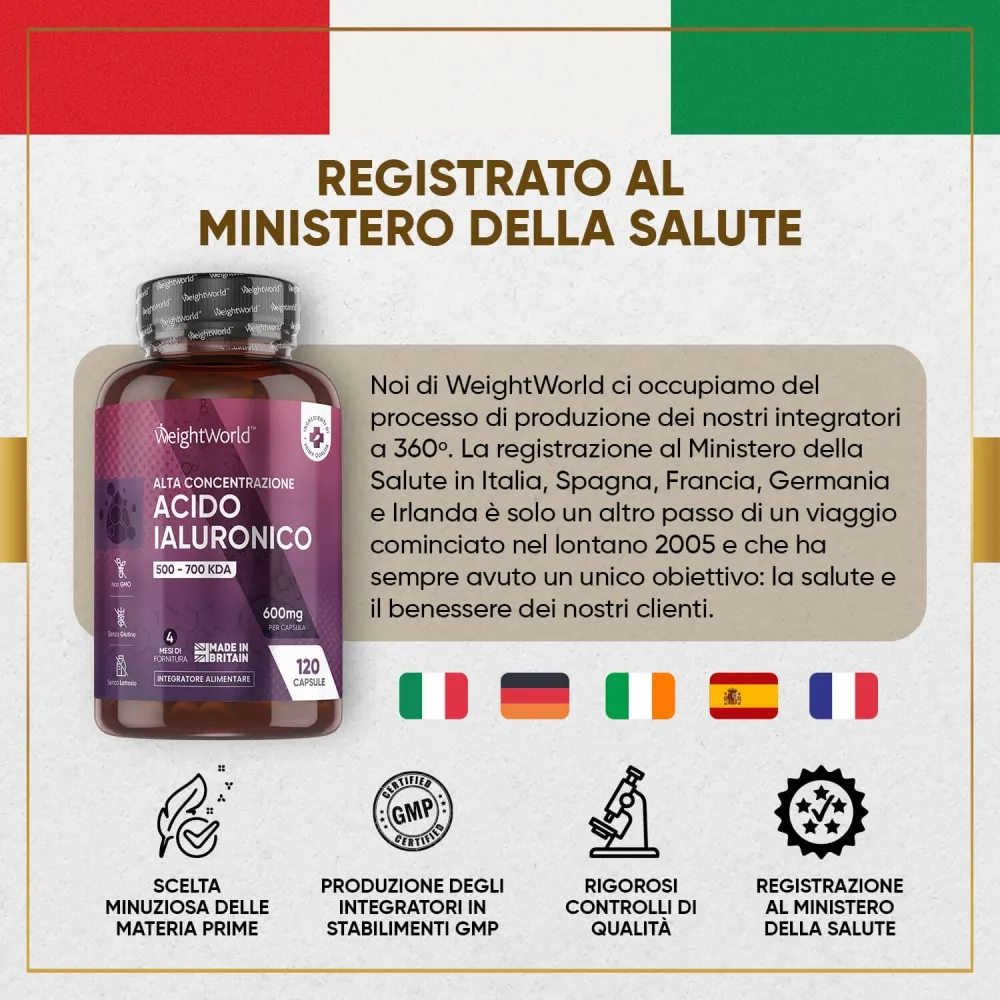 Le capsule di acido ialuronico di WeightWorld sono ideali per coloro che desiderano prendersi cura della propria salute ossea e articolare, nonché della propria pelle. Questo prodotto è perfetto per coloro che cercano benefici anti-invecchiamento, idratazione naturale e riparazione della pelle, in particolare per la guarigione delle ferite.