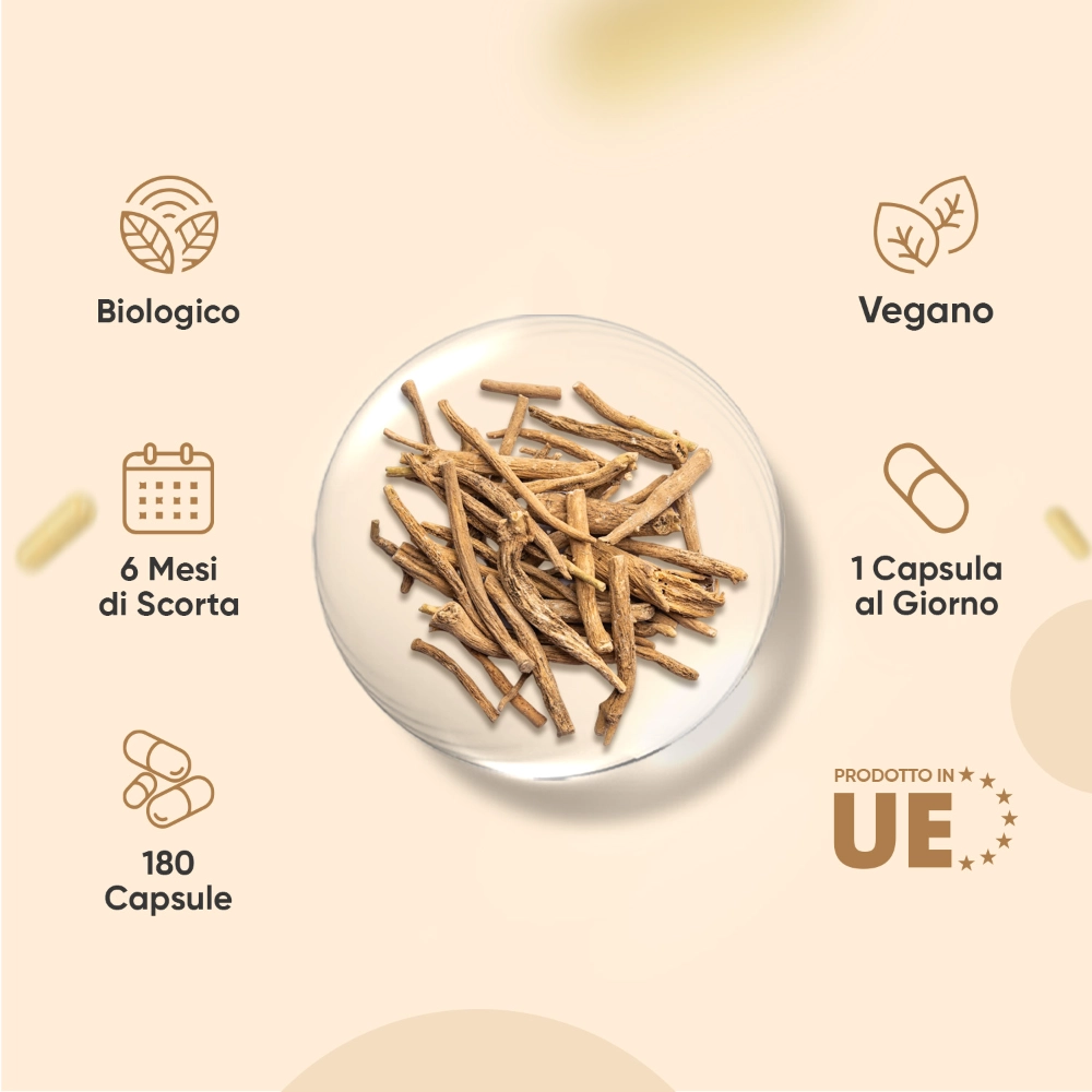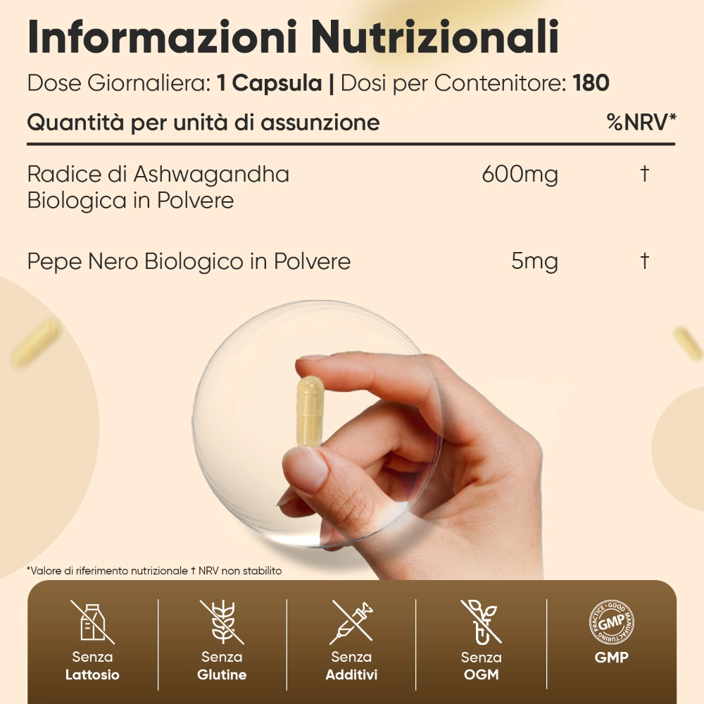 - Formula esclusiva da 605 mg di Ashwagandha bio