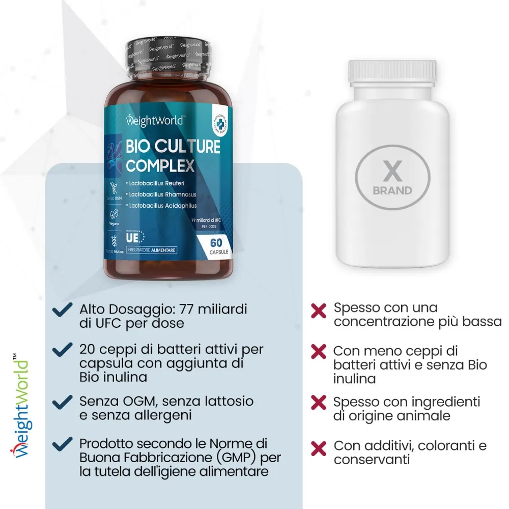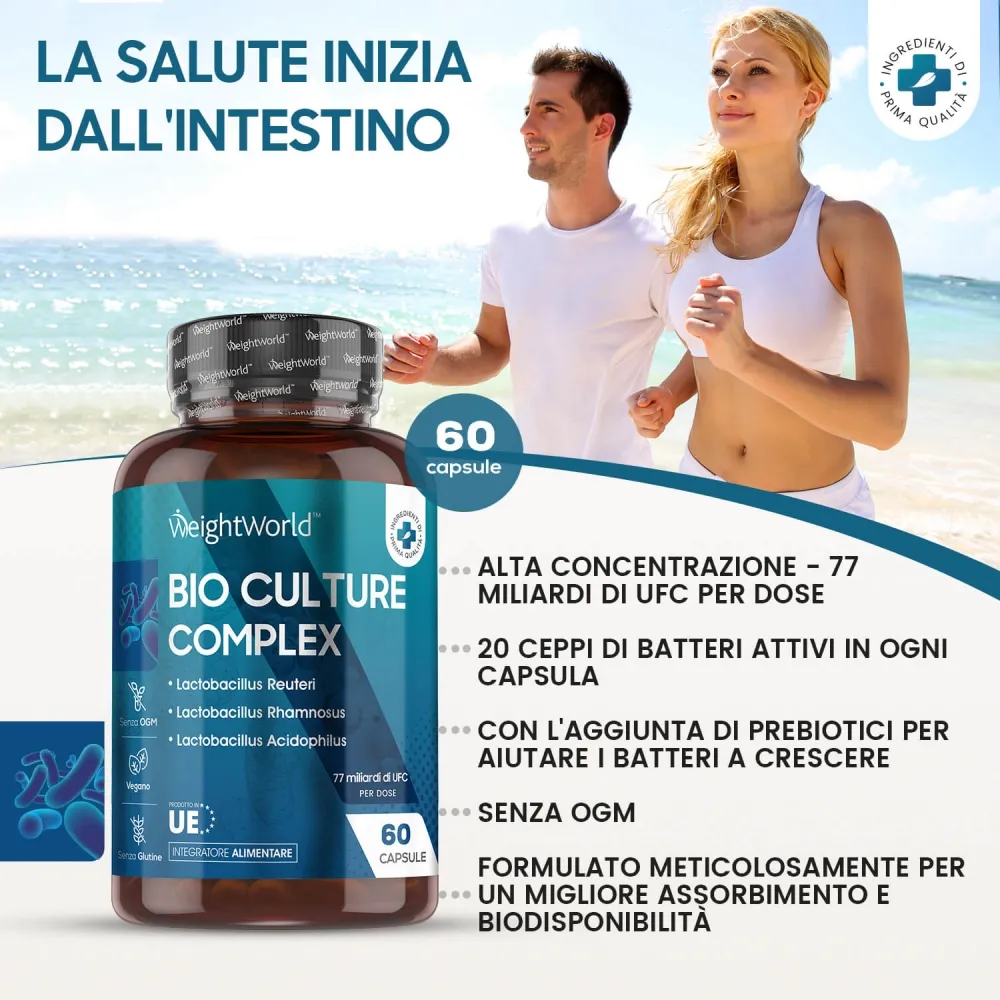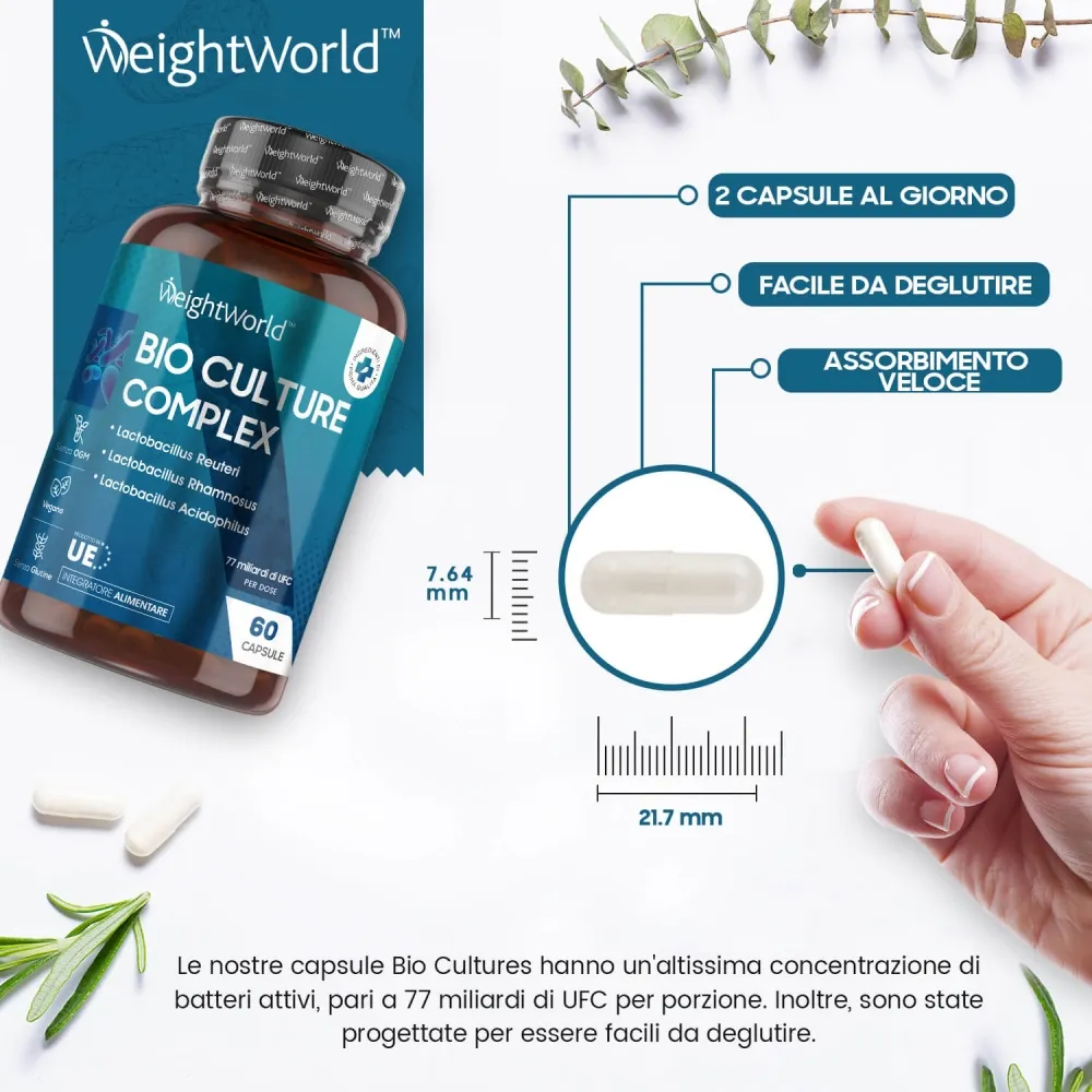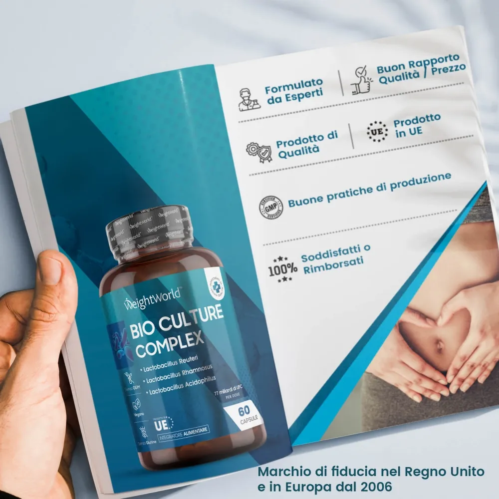 Che tu abbia una vita frenetica o una particolare sensibilità, queste capsule possono essere assunte quotidianamente senza alcuna preoccupazione. Quando il tuo stomaco funziona come dovrebbe riesce ad assorbire efficacemente vitamine e minerali essenziali, in modo da aumentare il tuo benessere a 360 gradi. Basta assumere 2 capsule al giorno a stomaco pieno con un bicchiere d'acqua per iniziare a scoprire i benefici di Bio Culture Complex.