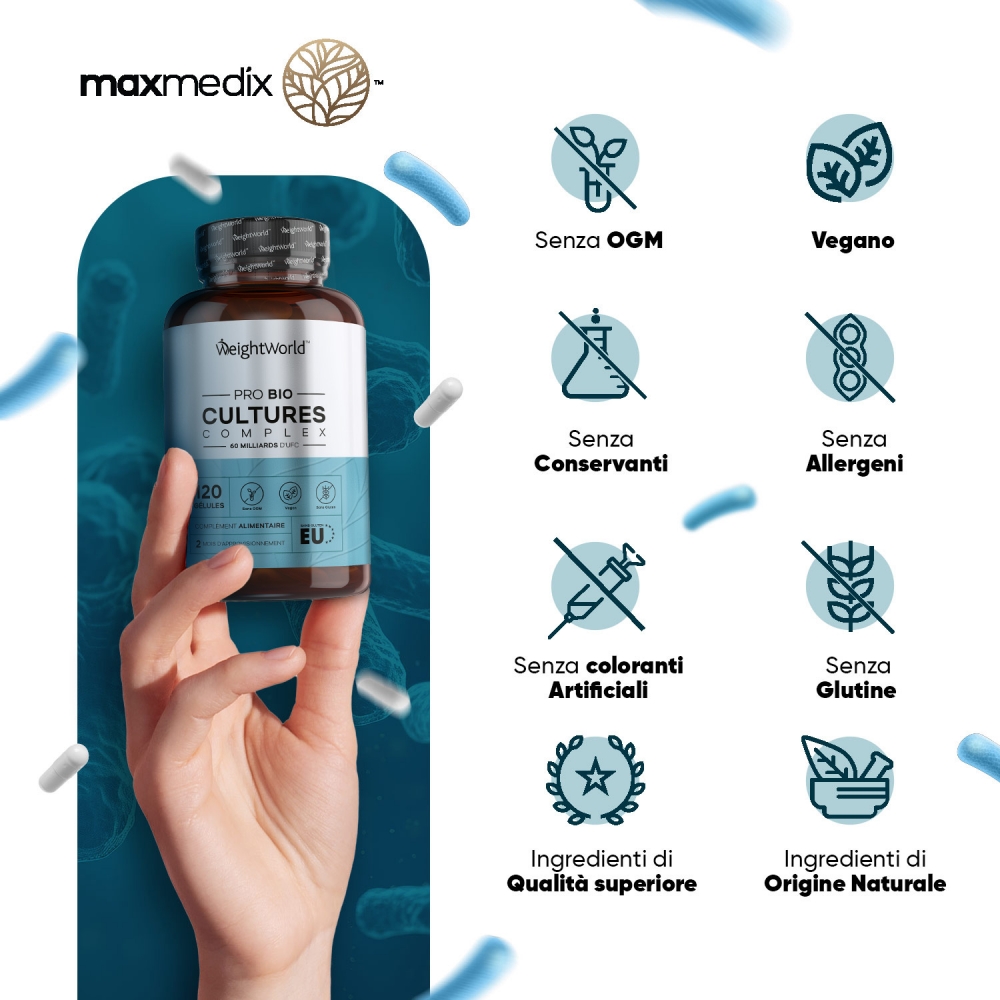 Non tutti i batteri sono cattivi! Infatti, i nostri corpi hanno bisogno di una costante fornitura di batteri buoni per funzionare al meglio. Ciò che tutti non sanno è dove reperire questi batteri buoni e in che quantità assumerne. La soluzione è Bio Cultures Complex Pro, un integratore di alta qualità sviluppato per darti la giusta quantità di batteri buoni ogni giorno. Questo integratore WeightWorld, infatti, contiene ben 60 miliardi di CFU di batteri buoni per capsula.