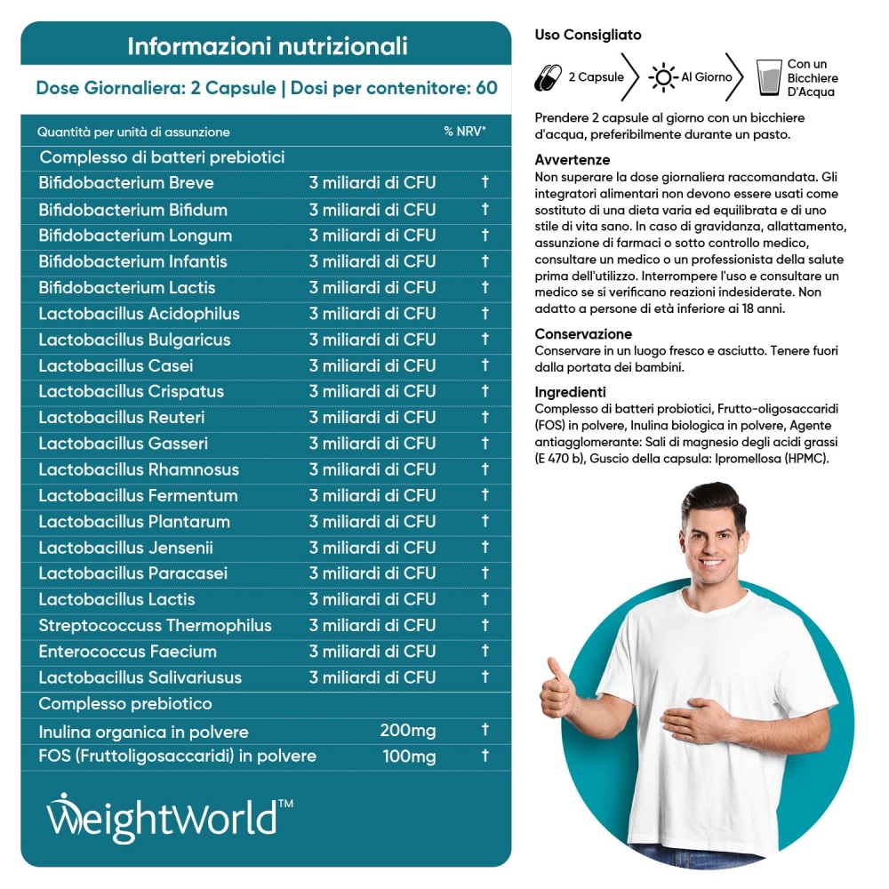 - Potente miscela di 60 miliardi di CFU di probiotici, prebiotici Inulina e FOS, un mix benefico a 360 gradi