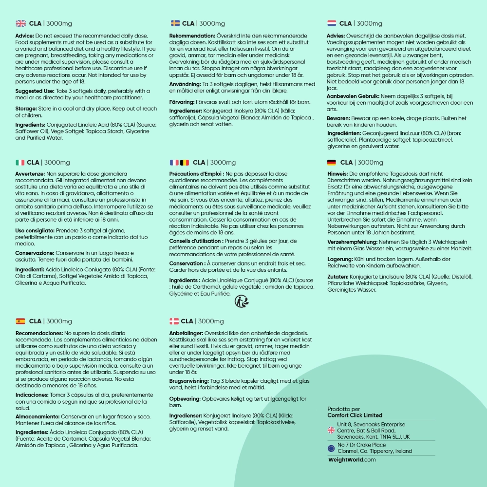 Acido linoleico coniugato (80% CLA) (fonte: olio di cartamo), softgel: Gelatina (fonte: amido di tapioca), glicerina e acqua purificata.