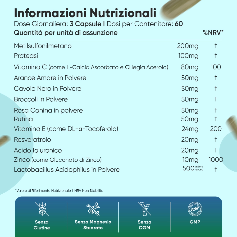 Leggi sempre la lista completa degli ingredienti in caso di allergie specifiche. Non superare la dose quotidiana consigliata. In caso di gravidanza o allattamento, o se si stanno assumendo farmaci specifici, consultare un medico prima dell’utilizzo. Interrompere l’utilizzo in caso di sintomi avversi. Non adatto ai minori di 18 anni.