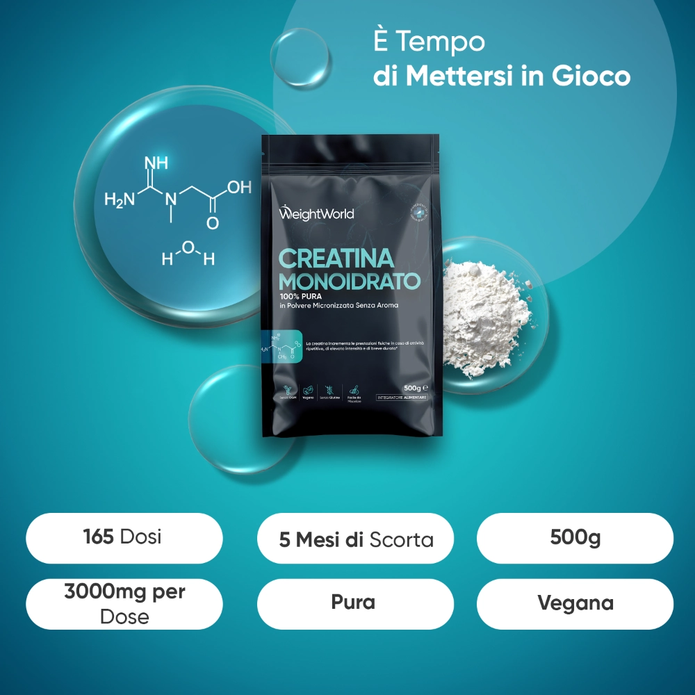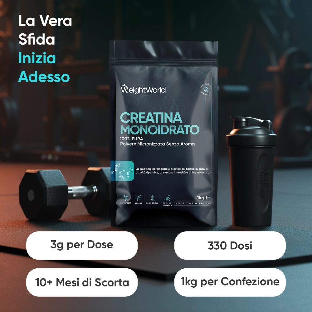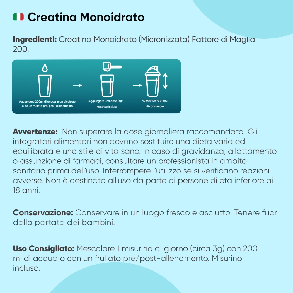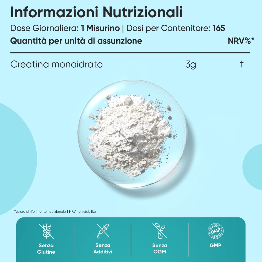 - Contiene creatina pura al 100% senza OGM o additivi artificiali