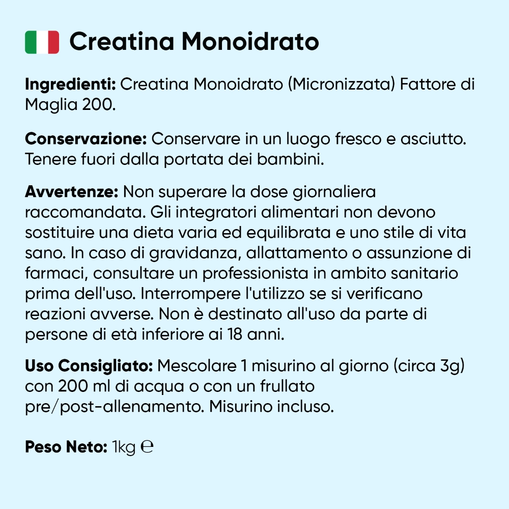 - Potente dose da 3 g di creatina per porzione, la quantità esatta di cui il tuo corpo ha bisogno per prestazioni ottimali in palestra