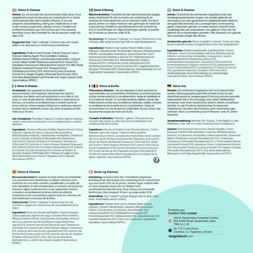 Per questo motivo, WeightWorld ha sviluppato Detox & Cleanse, un potente integratore detox in capsule completamente naturale. Ogni capsula contiene un potente mix di 13 ingredienti naturali, quali la fibra di crusca di frumento, la radice di tarassaco, calcio, 10 miliardi di CFU di batteri buoni e altri ancora, tutti noti per la loro capacità di aiutare il corpo a espellere le tossine e supportarti dall'interno. Ogni confezione contiene 180 capsule per 2 mesi di percorso detox.