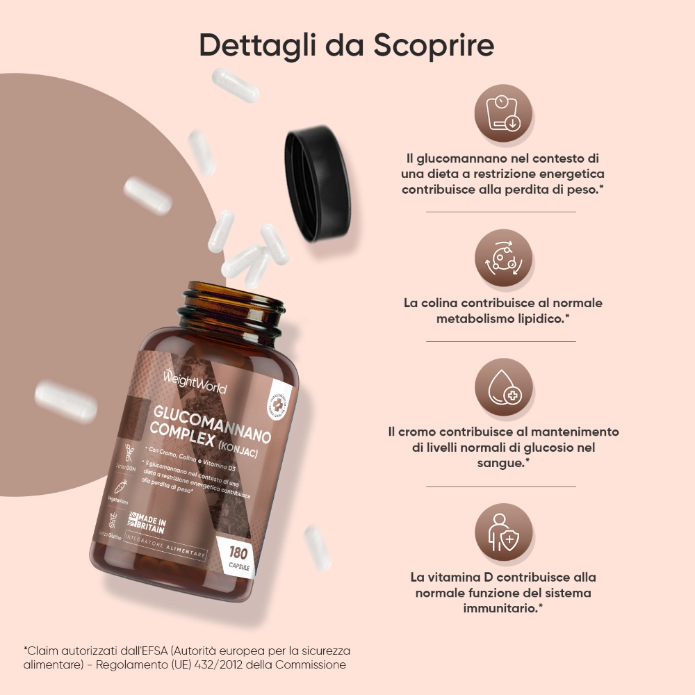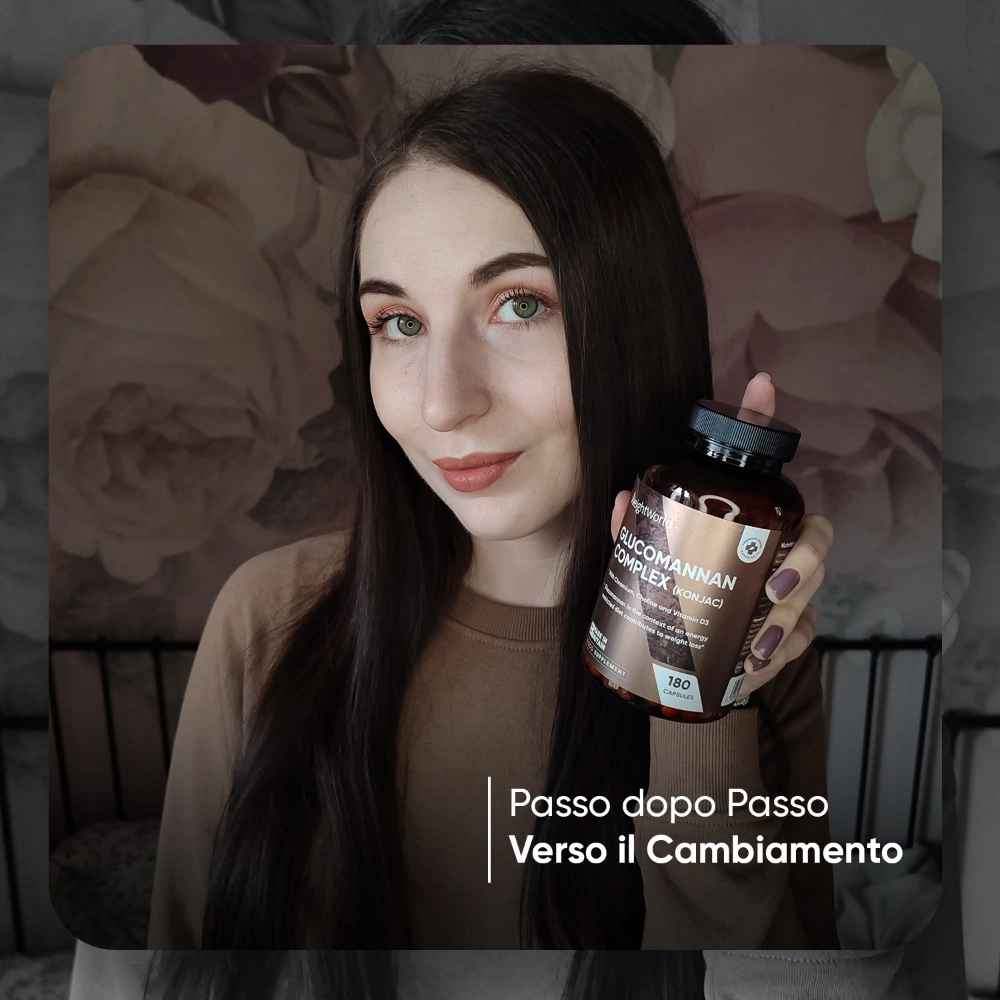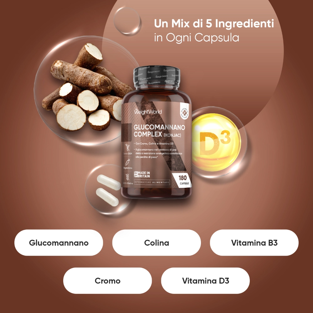 È difficile mantenere il proprio peso forma se si ha un continuo senso di fame. Prova Glucomannano Complex a base di radice di Konjac per aiutarti a controllare le voglie improvvise e a ridurre l'appetito. Con 3,000mg al giorno, associato ad una dieta bilanciata, il Glucomannano in capsule ti aiuterà a perdere peso, stimolando il senso di sazietà. Arricchito con Vitamina B3, Vitamina D3 e Cromo per mantenere i livelli di glucosio nel sangue, Glucomannano Complex è il tuo alleato nella perdita di peso!