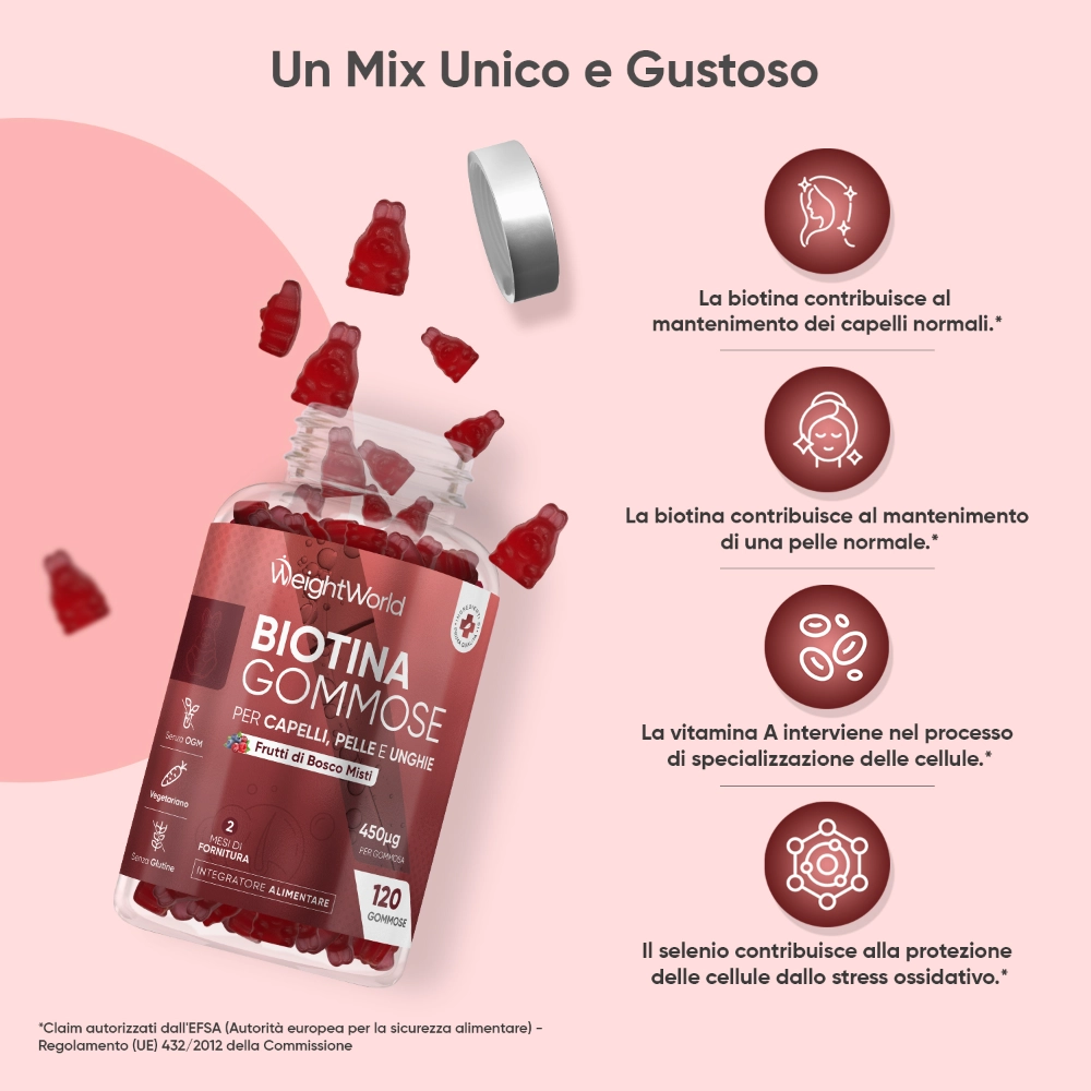 - 900 µg di biotina al giorno (2 gommose da 450 µg ciascuna)