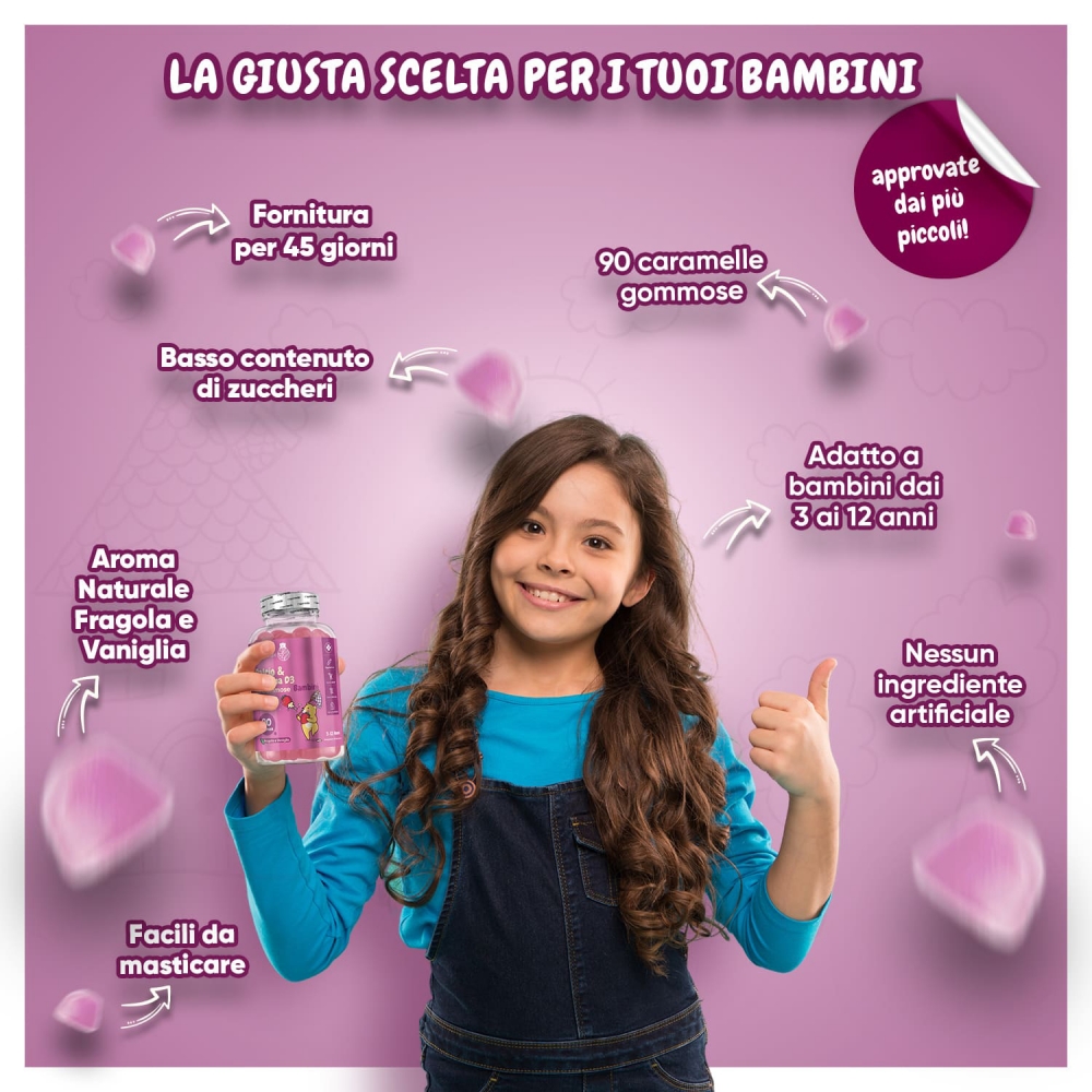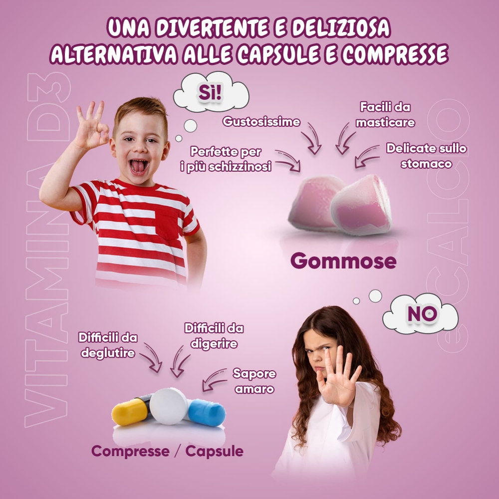 Le Gummies Calcio & Vitamina D3 sono un esclusivo integratore in deliziose caramelle gommose, pensato appositamente per le esigenze di crescita e sviluppo dei bambini e ragazzi dai 3 ai 12 anni. Ciascuna gommosa, dall’aroma naturale di fragola e vaniglia, offre un apporto ottimale di calcio e vitamina D3 in un formato pratico, gustoso e divertente, rendendo l'assunzione di questi nutrienti fondamentali per la salute un vero e proprio gioco da ragazzi.