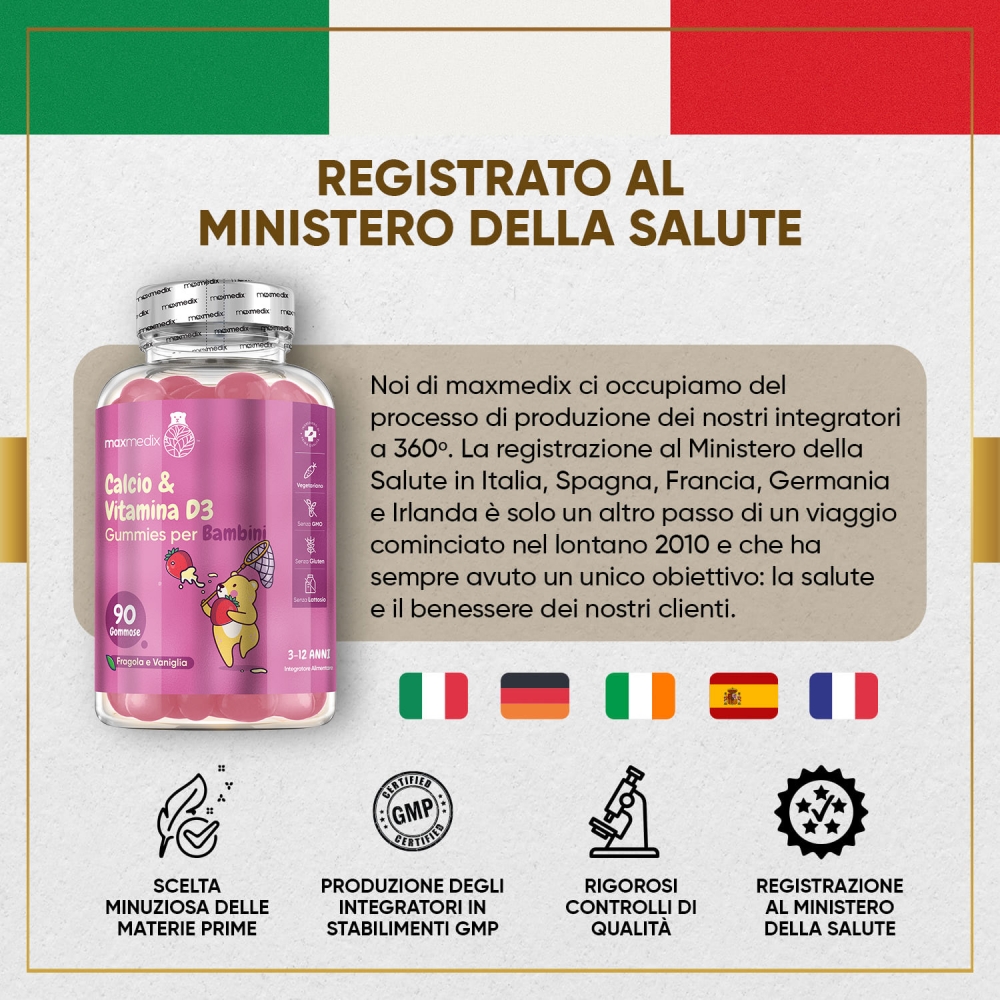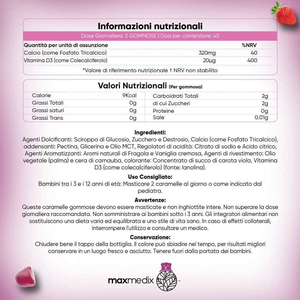 Il 99% del calcio presente nel nostro corpo è immagazzinato nelle ossa e svolge un ruolo vitale nel conferire loro struttura e resistenza. Per questo motivo è considerato essenziale nei processi di crescita. Non sempre, tuttavia, è facile garantire un apporto ottimale di questo prezioso ingrediente, soprattutto per bambini e ragazzi. Per questo motivo le Gummies maxmedix contengono una dose potenziata di vitamina D3, in grado di supportare e veicolare l’assorbimento del calcio.