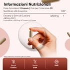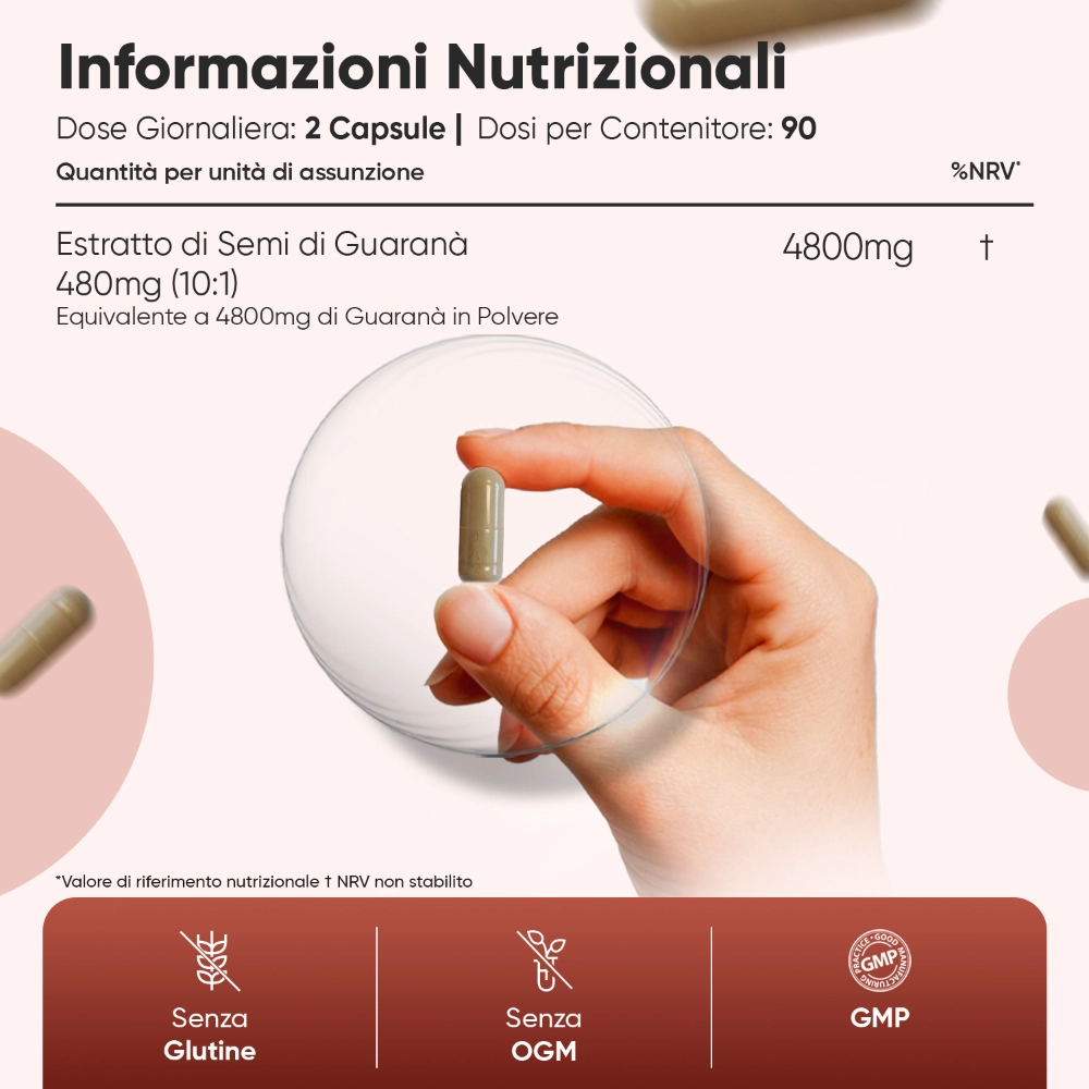 Con le nostre capsule potrai sostenere regolarmente i tuoi livelli di energia fisica e mentale in maniera del tutto naturale e sicura. Ogni capsula contiene una concentrazione di 4800mg di estratto di Guaranà Puro, uno dei più potenti disponibili, senza doverti più preoccupare di dosaggi e quantità. Facili da ingerire e assorbire, sono veloci, convenienti e si adattano anche allo stile di vita più impegnativo. Prendi una capsula, fino a tre volte al giorno, per beneficiare di una carica energetica aggiuntiva e dare una spinta alla tua vitalità. Suggeriamo inoltre di assumere l’integratore per almeno tre mesi, investendo in un uso a lungo termine per massimizzare i risultati. Guaranà Puro in Capsule è perfetto per gli appassionati di fitness, gli studenti universitari che lavorano sodo, i genitori impegnati e quelli che generalmente cercano di soddisfare i loro bisogni energetici in modo sano senza bevande energetiche zuccherate.