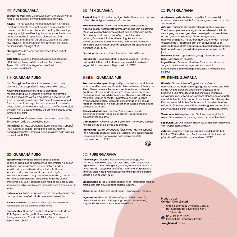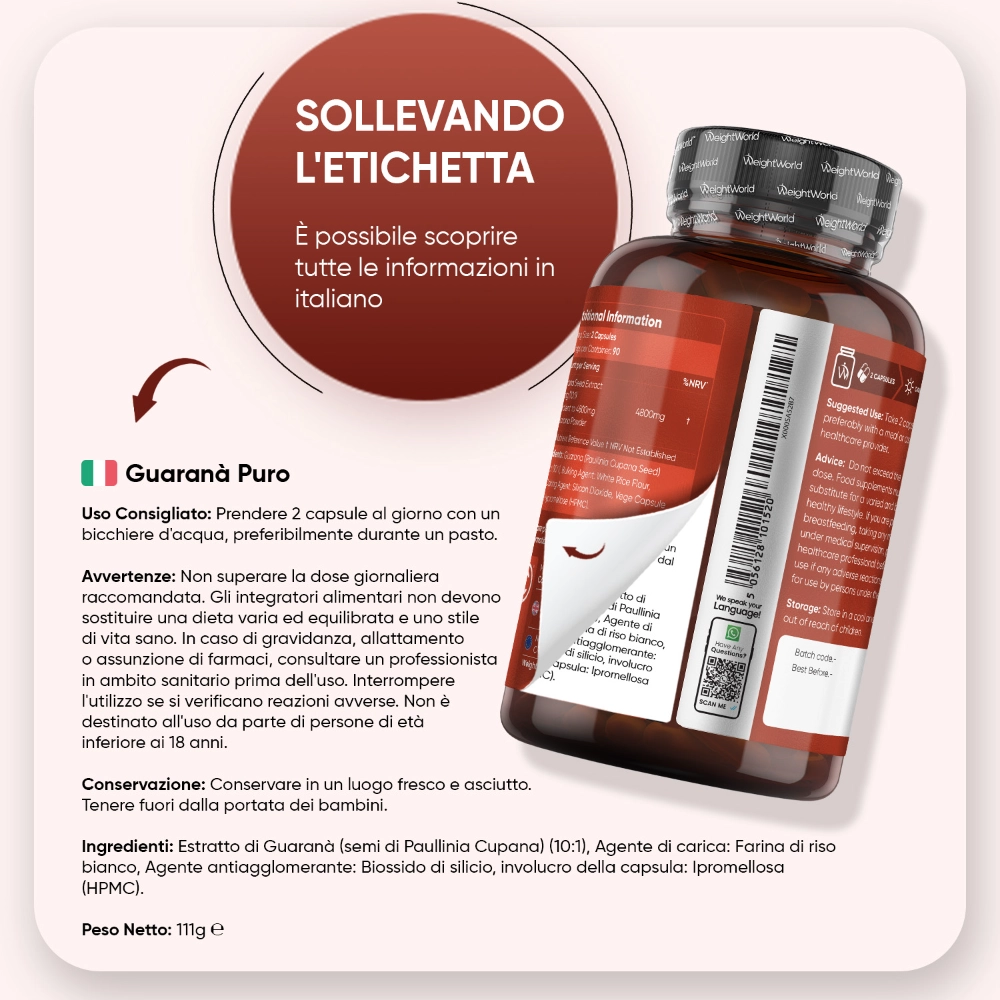 Le capsule di Guaranà Puro contengono un solo principio attivo naturale, senza sostanze chimiche nocive e completamente adatto a diete vegane, vegetariane e a intolleranti a glutine e lattosio. Tuttavia si prega di dare un’occhiata a tutti gli ingredienti, in caso di eventuali allergie personali. Come con qualsiasi nuovo integratore, consigliamo di verificare la compatibilità di questo integratore in caso di assunzione di farmaci. Questo prodotto non è destinato a persone di età inferiore ai diciotto anni, a donne in gravidanza o in allattamento e a persone con sensibilità o intolleranza alla caffeina. However, please take a careful look at the full ingredients, in case of any personal allergens.