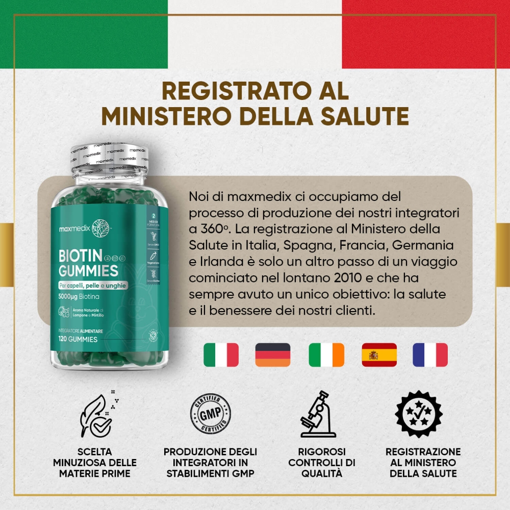 Le nostre gummies alla Biotina hanno una formulazione ad alto dosaggio con sole 2 caramelle al giorno. Ogni confezione contiene 120 gummies per 2 mesi e puoi risparmiare ancora di più acquistando 3 confezioni con il 20% di sconto. Sono naturali, con una formula adatta anche a vegetariani. Inoltre, puoi acquistarle in tutta sicurezza grazie alla nostra Garanzia Soddisfatti o Rimborsati. Provale subito per prenderti cura della tua pelle e dei tuoi capelli.