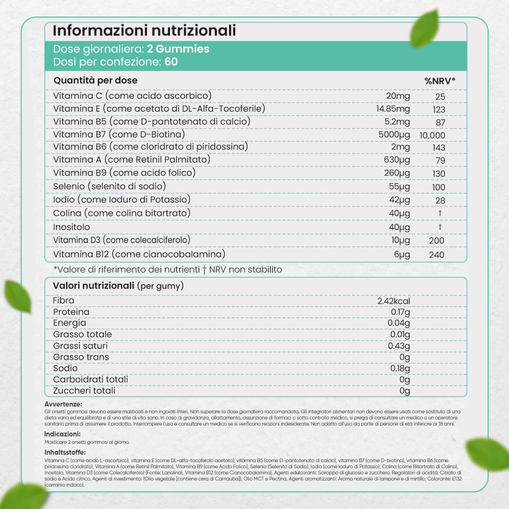 Ti basta masticare 2 gummies al giorno. Puoi decidere tu l’orario di assunzione, ma raccomandiamo di mantenere lo stesso orario tutti i giorni per una maggiore continuità. Inoltre, ricorda che questi orsetti gommosi alla biotina non vanno ingoiati per interi, ma masticati fino ad estrarne completamente i succhi.