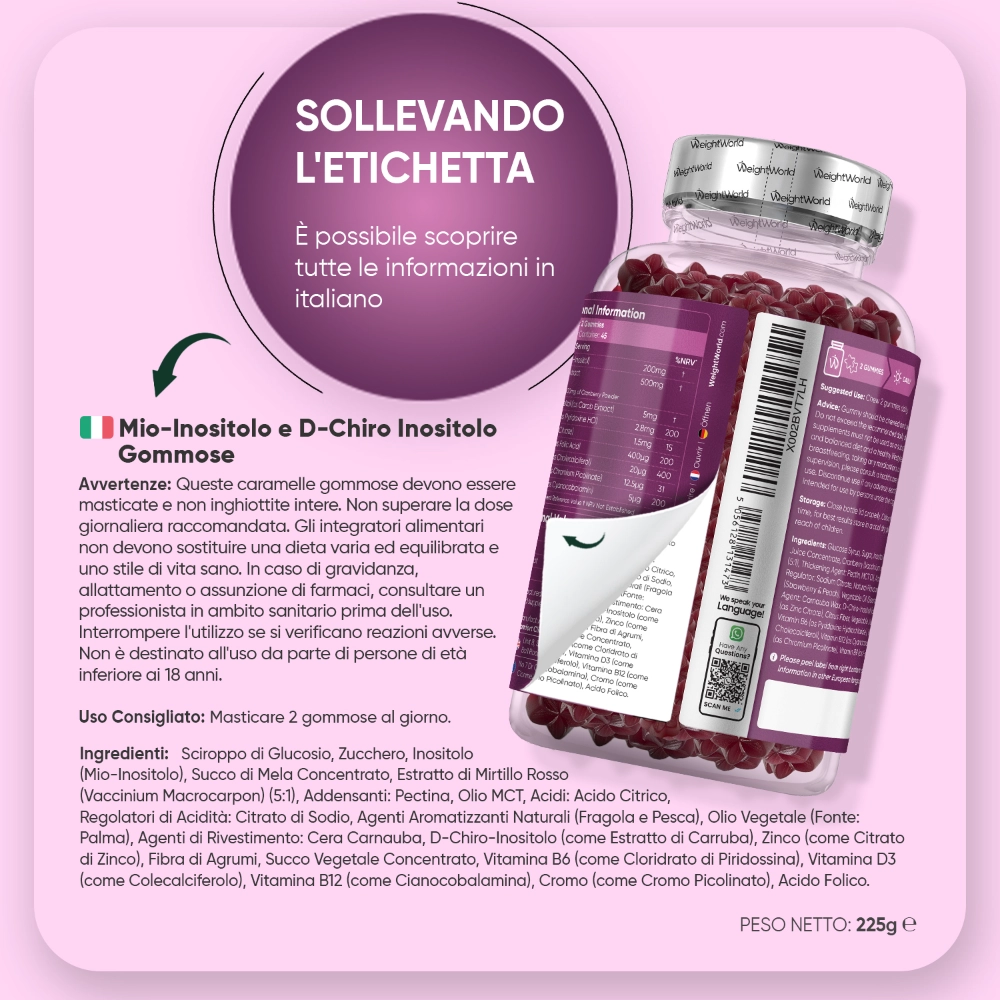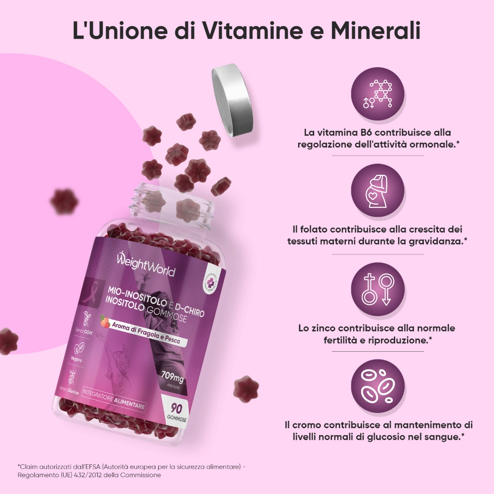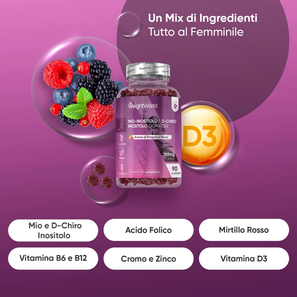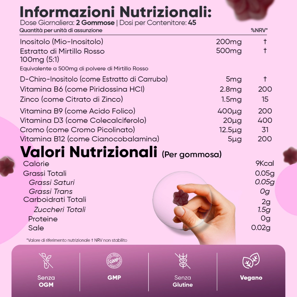 - Con 200 mg di Myo-Inositolo e 5 mg di D-Chiro Inositolo in rapporto 40:1.