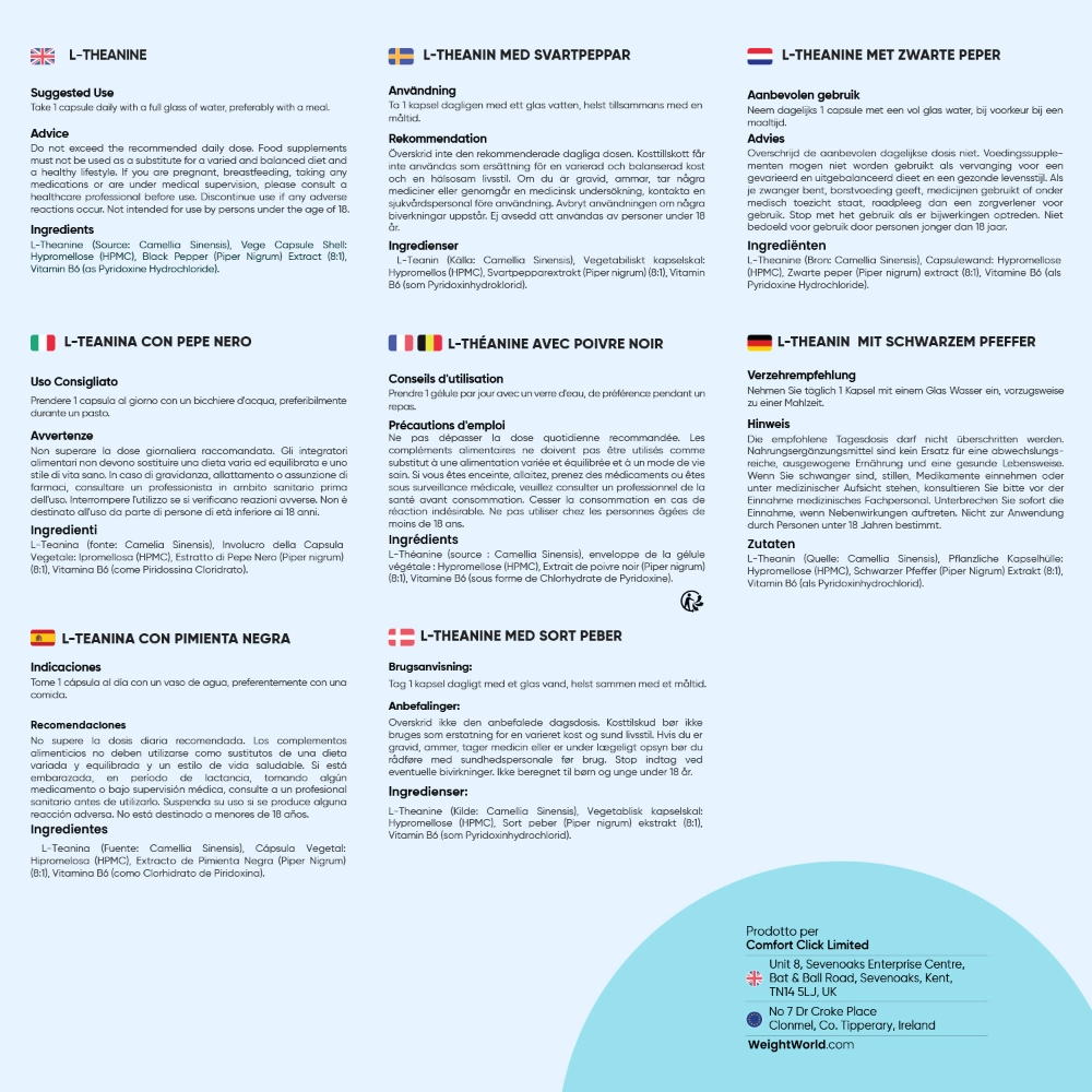 Hai sempre paura di trovare qualche sorpresa quando guardi la lista degli ingredienti di un prodotto? Non temere, ogni capsula è costituita da 400 mg di L-Teanina, con aggiunta di 8 mg di Pepe Nero, oltre alla Vitamina B6. ed è racchiusa in un guscio di vegetali realizzato con ipromellosa, che è insapore e completamente vegetariana e vegana.