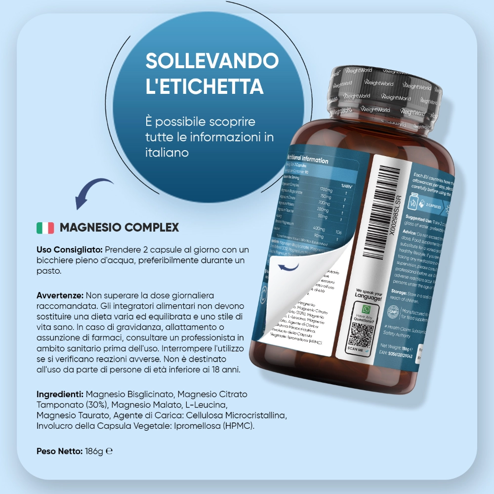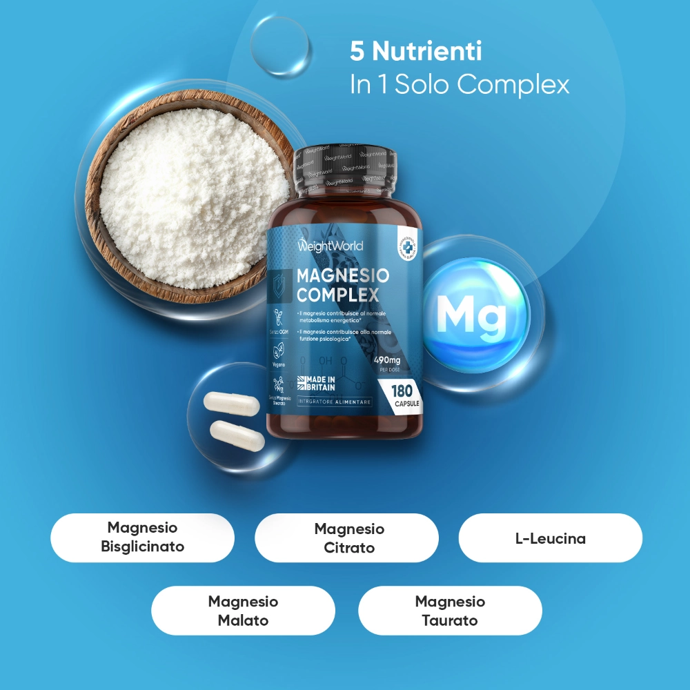 - 4 forme di magnesio in un'unica capsula: bisglicinato, citrato, malato e taurato