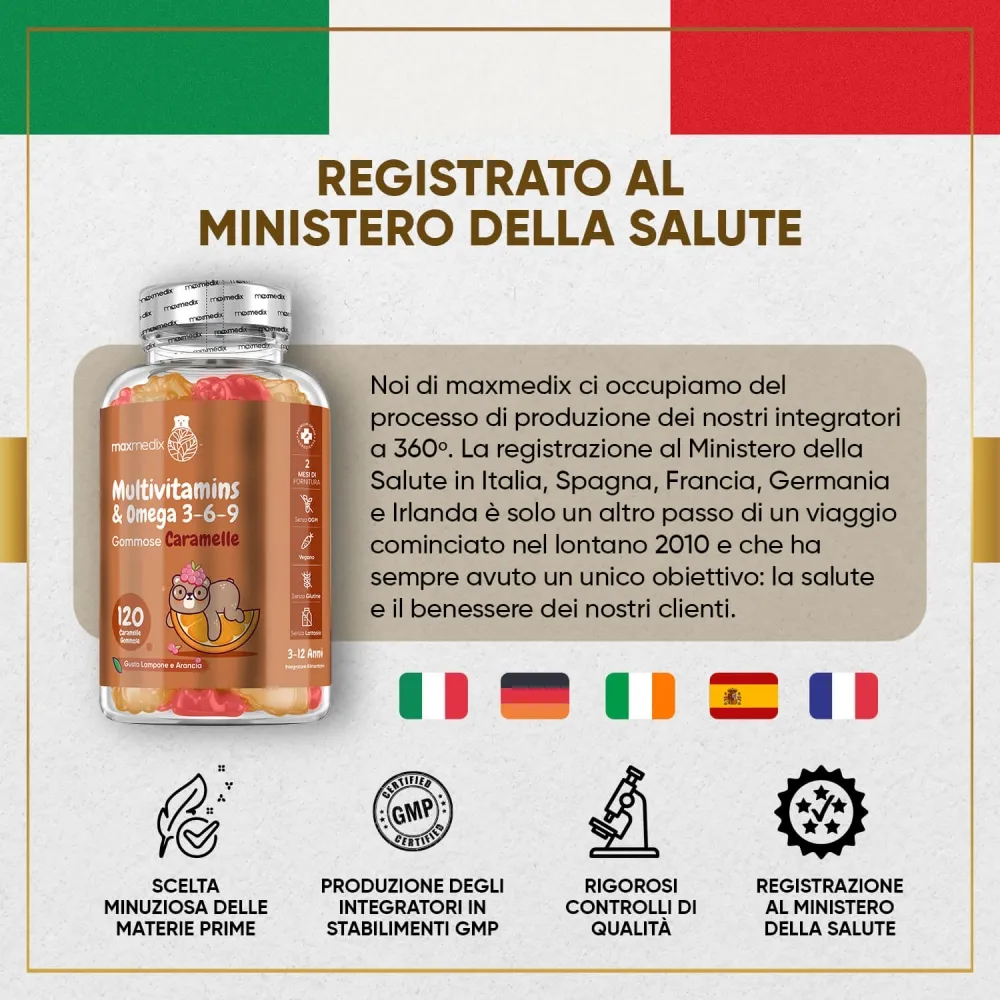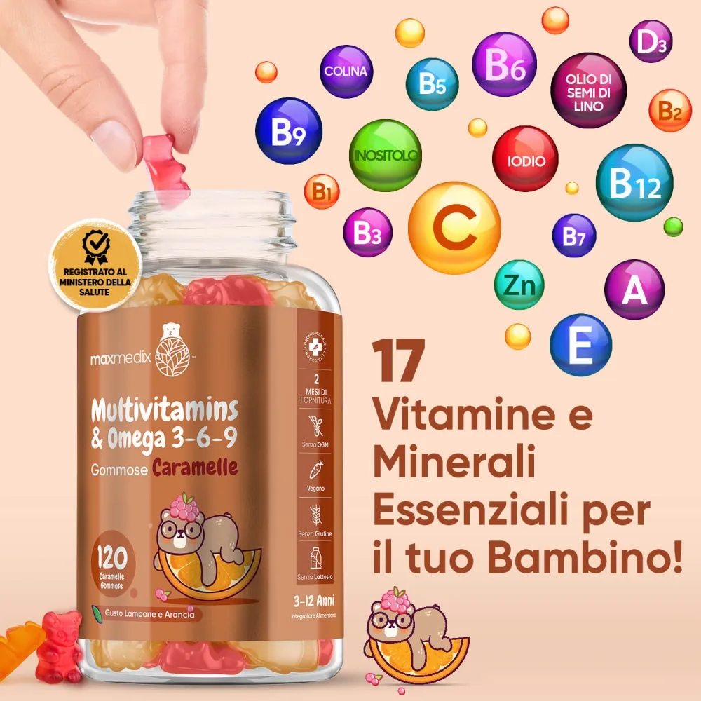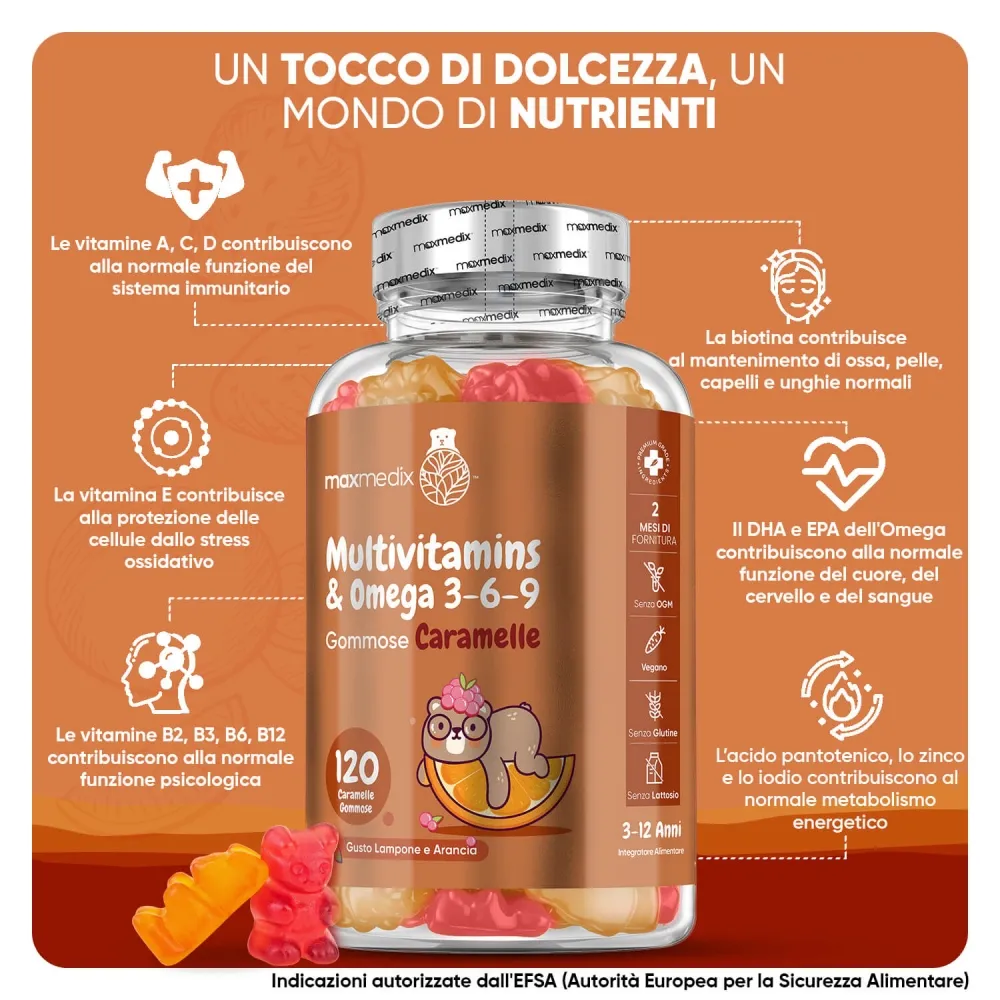 Esistono sul mercato sempre più integratori destinati ai più piccoli, ma noi siamo sicuri che i nostri orsetti gommosi multivitaminici sono la soluzione ideale per supportare la crescita dei tuoi bambini. In primis, la formula unica, che aggiunge ai benefici delle vitamine la potenza antiossidante degli Omega 3, 6 e 9, conosciuti anche per le loro proprietà di supporto allo sviluppo del sistema nervoso dei più piccoli. Alla formula si aggiunge il formato, in deliziose caramelle gommose: assicurarti che i tuoi piccoli prendano le vitamine sarà semplicissimo! Inoltre, la confezione da 120 gummies copre 2 mesi di utilizzo, per un rapporto quantità prezzo imbattibile. Provale ora con la Garanzia Soddisfatti o Rimborsati!