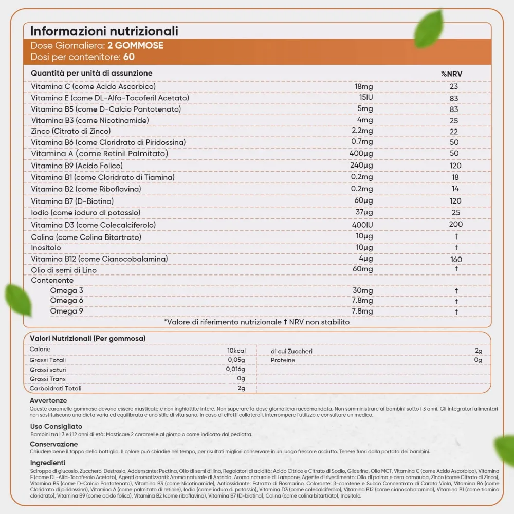 Le Multivitamine Gommose per Bambini sono adatte ai bambini dai 4 ai 12 anni. Ogni bambino dovrebbe seguire una dieta equilibrata con frutta e verdura ogni giorno, ma non è sempre facile bilanciare ogni pasto quando si lavora o si svolgono le faccende domestiche. I multivitaminici possono colmare il divario, assicurando che i bambini crescano felici e sani.