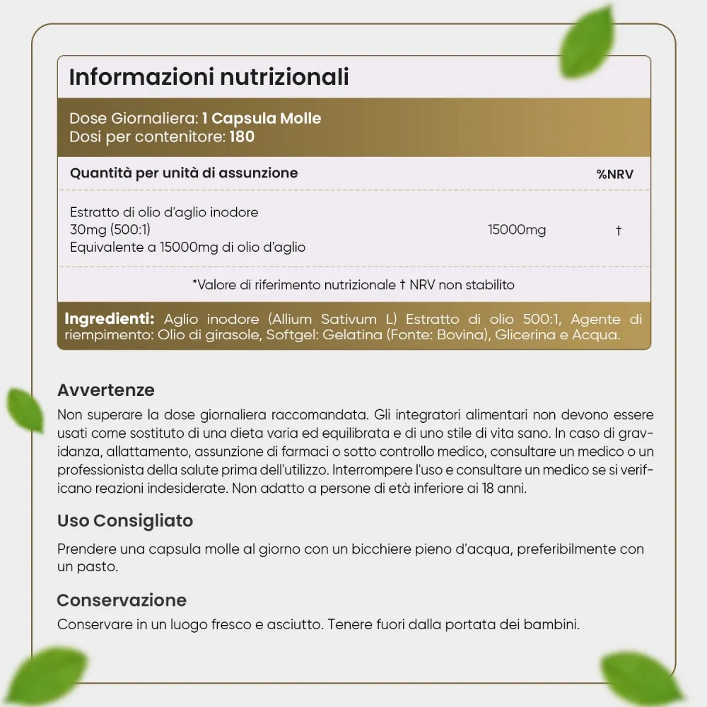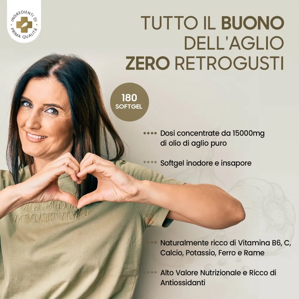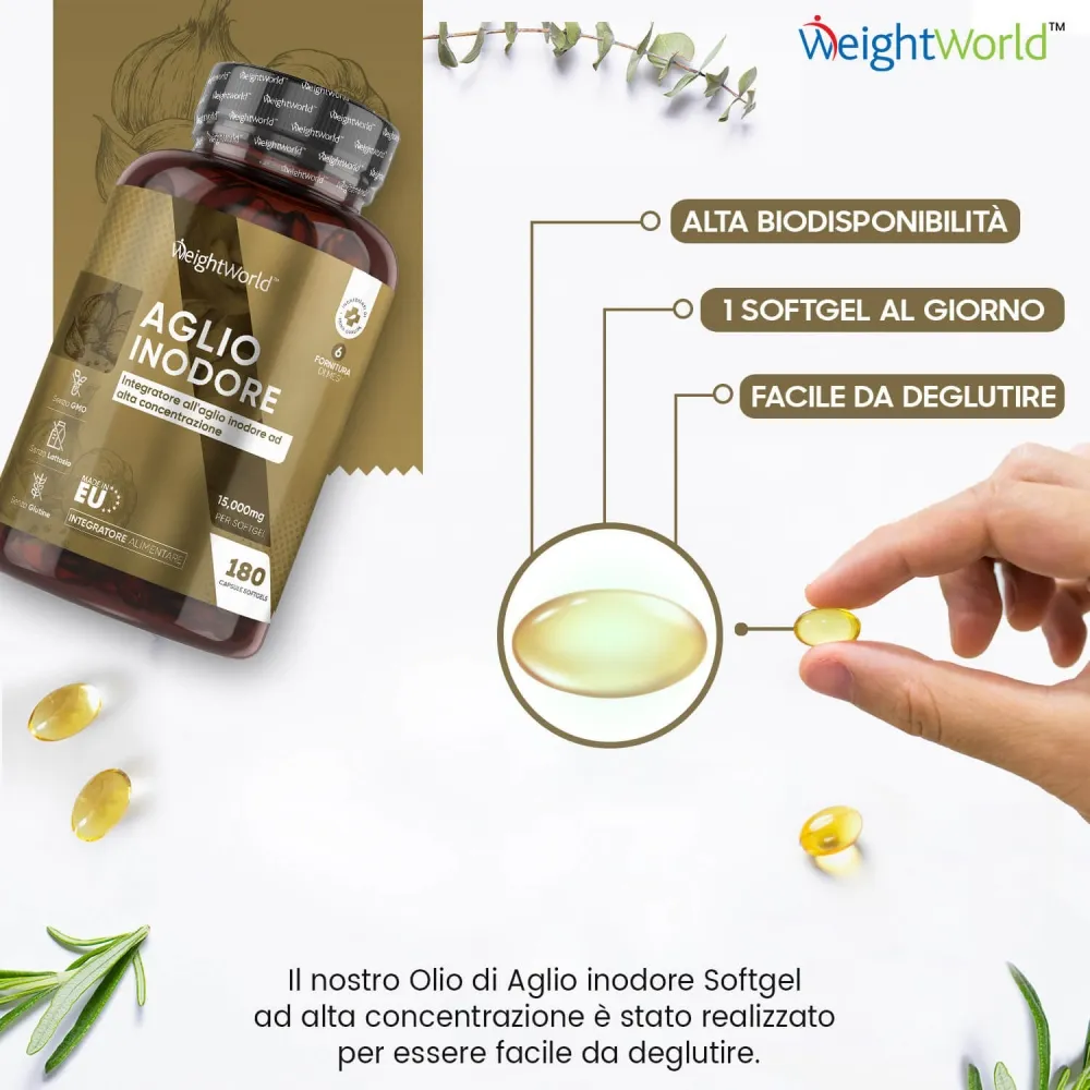 L'Aglio è utilizzato da secoli come antibatterico naturale ed è noto per i benefici sul cuore e sul sistema vascolare. WeightWorld ha sviluppato l'integratore di Olio di Aglio senza odore, che racchiude in sé tutti i benefici di questo meraviglioso ingrediente naturale. La nostra formula forte contiene 15,000 mg di estratto di Aglio per porzione. La formulazione in Softgel permette un assorbimento maggiore di Allicina, il principio attivo che è alla base dei benefici dell'aglio.
