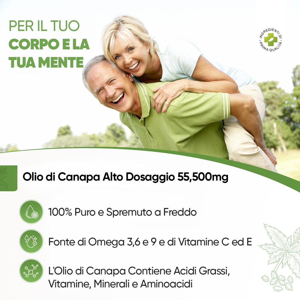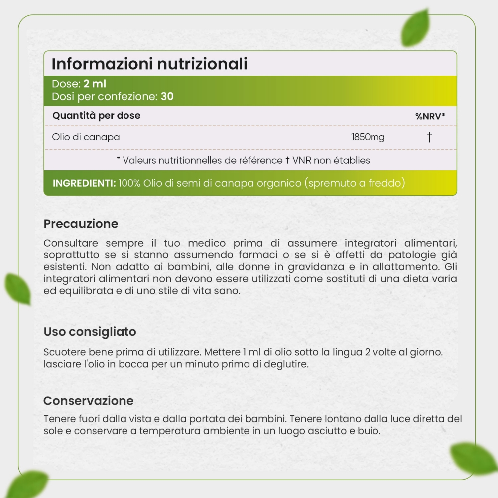 L'Olio alla Canapa è privo delle sostanze psicoattive che alterano le abilità cognitive presenti nelle piante della famiglia della Canapa e non ha effetti collaterali noti.