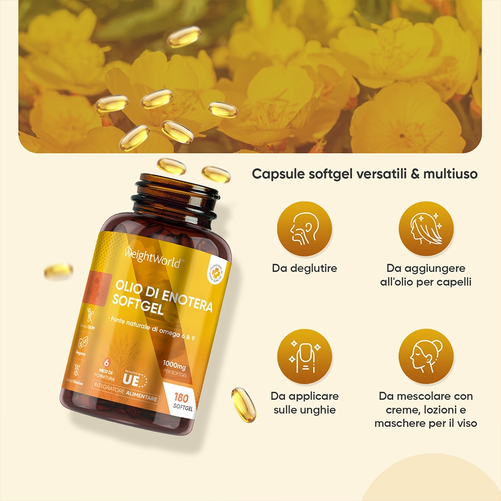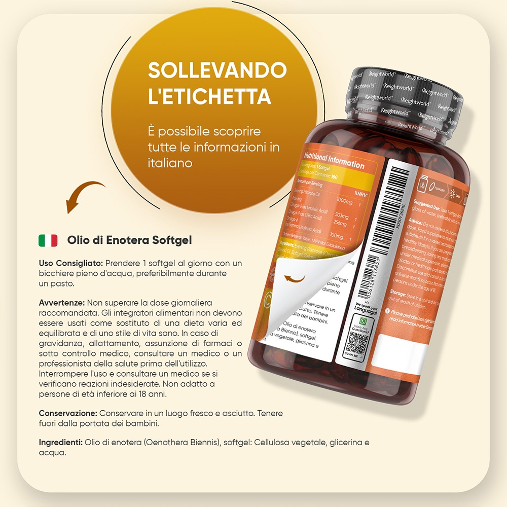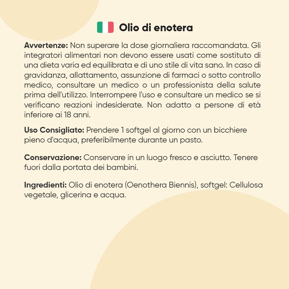 L'Olio di Enotera in Capsule Softgel è ideato per essere integrato all’interno di un equilibrato regime alimentare e di un regolare esercizio fisico. La mancata osservanza di queste ultime condizioni può determinare l’inefficacia del prodotto. Gli integratori alimentari non vanno intesi come sostituti di un pasto. Leggere attentamente la lista completa degli ingredienti prima dell’utilizzo per verificare di non essere allergici a nessuno di essi.