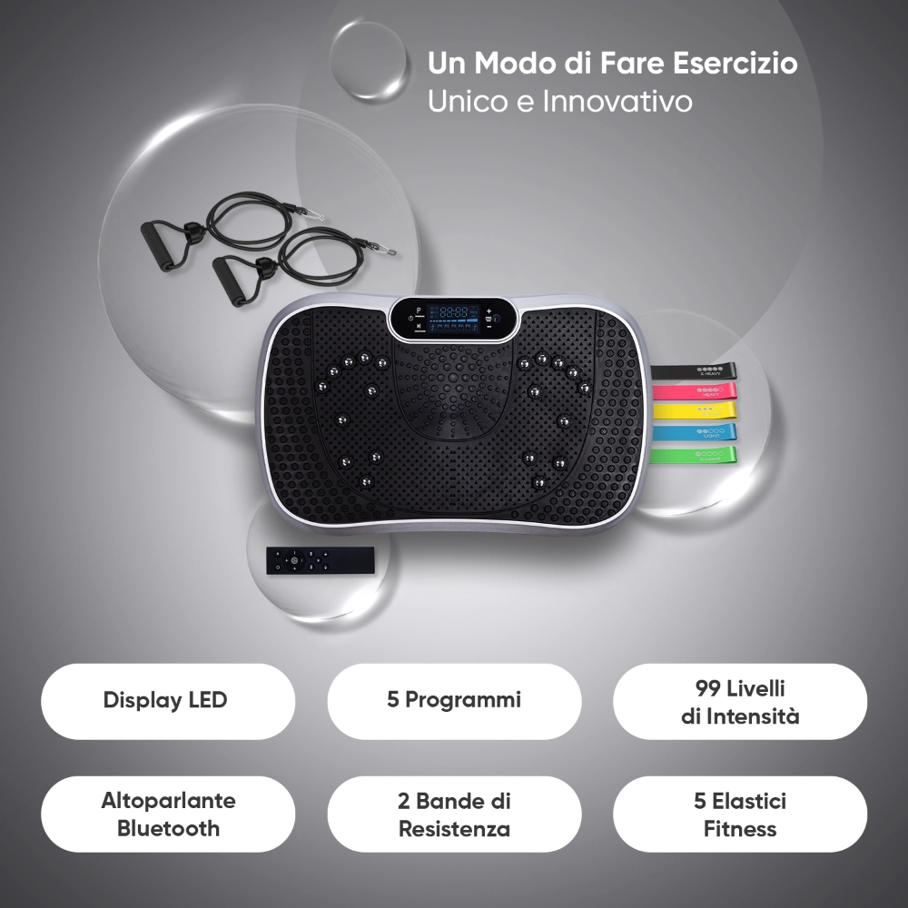 Questo speciale dispositivo rende il tuo allenamento ancora più efficace grazie alla sua tecnologia. Mentre ti alleni, infatti, la vibrazione della pedana contribuisce a tonificare e rafforzare i muscoli che stai sforzando e quelli a riposo. Per questo, anche solo stare in piedi sulla pedana risulta benefico per i muscoli delle gambe. Puoi regolare la vibrazione in base alle tue esigenze con il pratico telecomando.