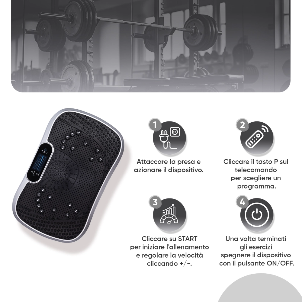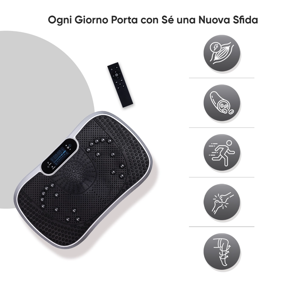 Scopri ora la nuova Pedana Vibrante WeightWorld per un allenamento completo direttamente a casa tua. Questo device avanzato di allenamento è stato progettato per aiutarti a tonificare i muscoli mentre svolgi i tuoi esercizi. Grazie alle vibrazioni, infatti, potrai stimolare diverse fasce muscolari, contrastare il grasso in eccesso e tonificare il corpo. Gli allenamentii sono personalizzabili a seconda del livello scelto e puoi cominciare a rimetterti in forma con semplici sessioni da 20 minuti.