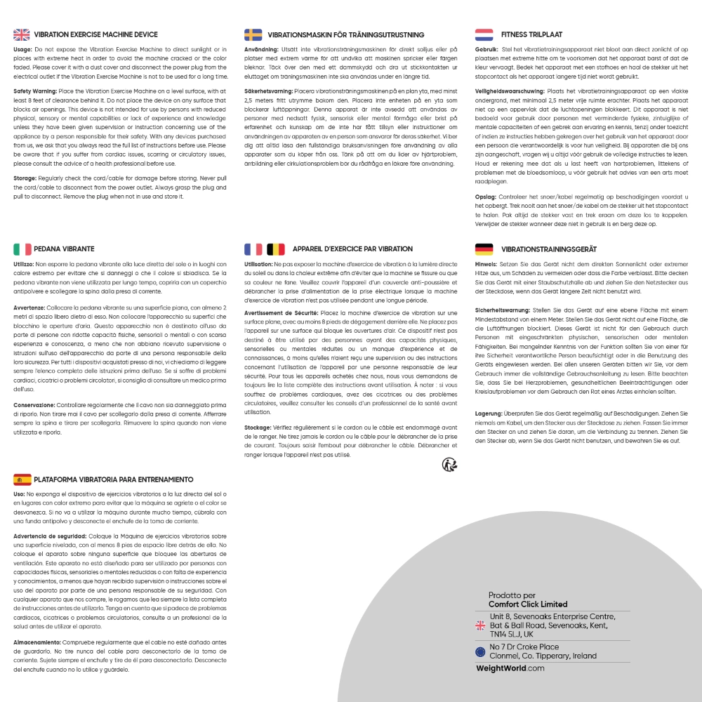 Consultare il manuale dell'utente prima di utilizzare il dispositivo. Posizionare sempre la tavola su una superficie piana e tenere lontano da animali domestici e bambini. Si consiglia di non utilizzare questa piastra se: recentemente si è stati sottoposti a intervento chirurgico, si ha subito un grave infortunio in caso di gravidanza. Consultare un medico prima dell'uso in caso di patologie.