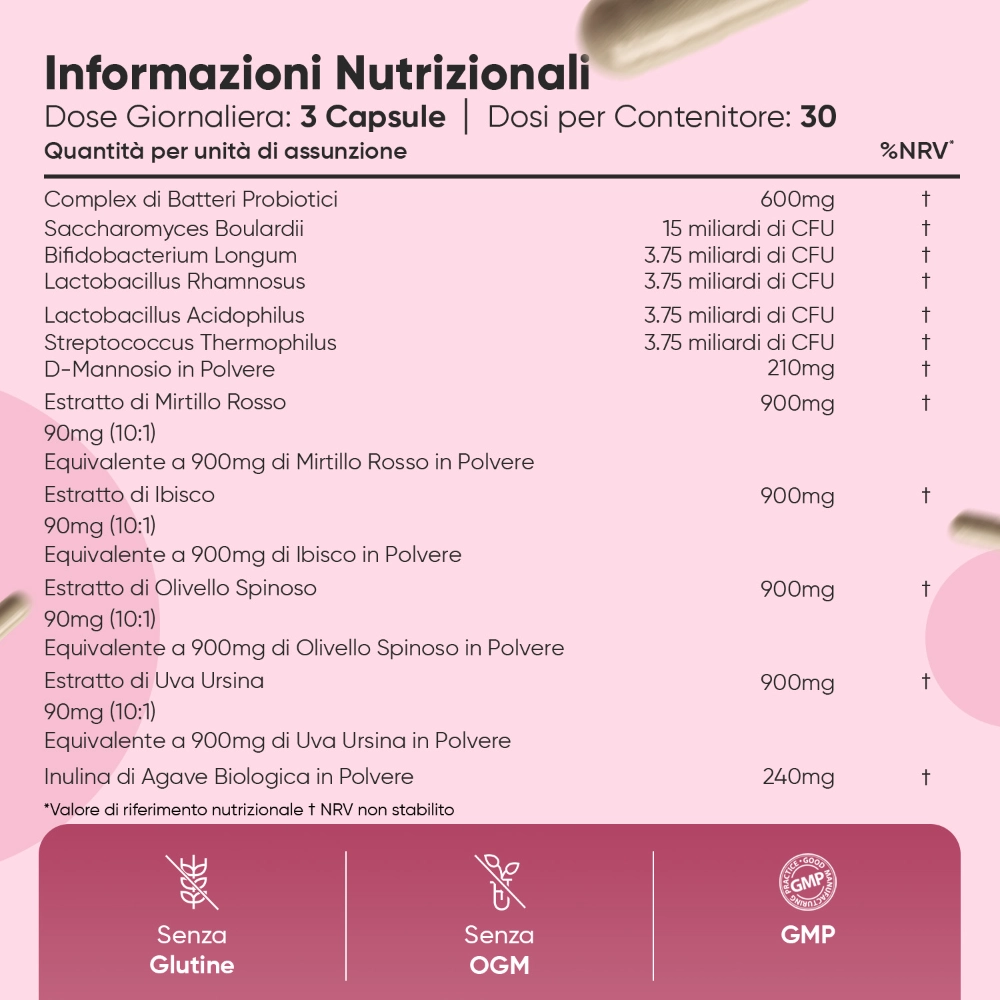 90 Capsule Vegane | 30 Miliardi CFU con D-Mannosio, Mirtillo rosso, Ibisco & Olivello Spinoso