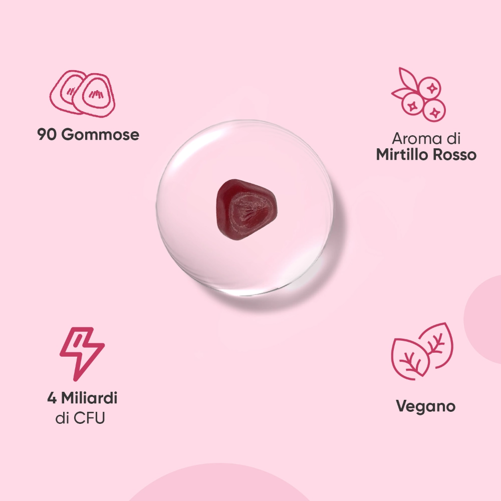 Ogni dose (2 gommose) apporta 4 Miliardi di CFU da 4 ceppi probiotici diversi, più una selezione di ingredienti pensati specificamente per le esigenze femminili: D-Mannosio, Mirtillo Rosso, Olivello Spinoso e Olio di Enotera. Una formula completa che lavora su più fronti: intestino, vie urinarie e benessere psico-fisico.