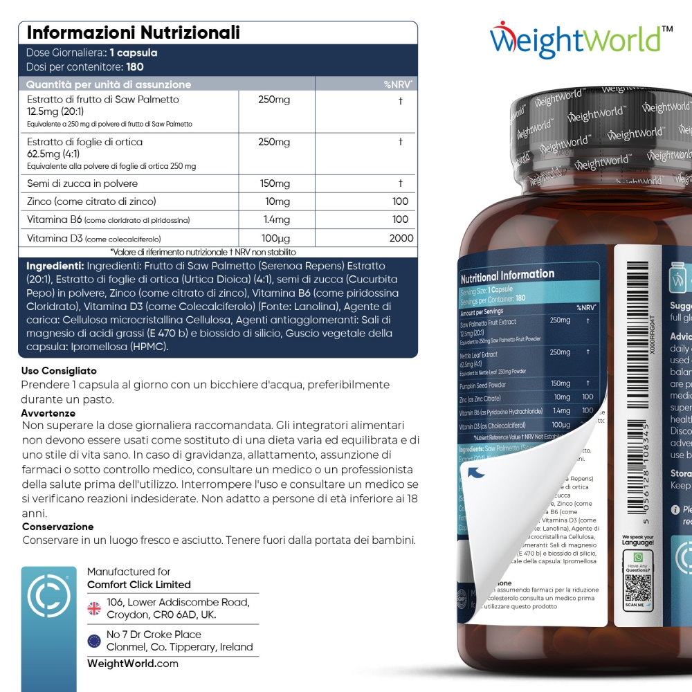 Dopo approfondite ricerche sulla prostata e sui migliori ingredienti naturali per prendersene cura, WeightWorld ha creato ProstaSURE. Questo integratore alimentare aiuta a fornire vitamine e minerali come zinco, selenio e vitamina D3, che contribuiscono alla salute e al benessere maschile. Il prodotto contiene inoltre un’alta percentuale di isoflavone, un tipo di flavonoide conosciuto per le sue proprietà anti-ossidanti.
