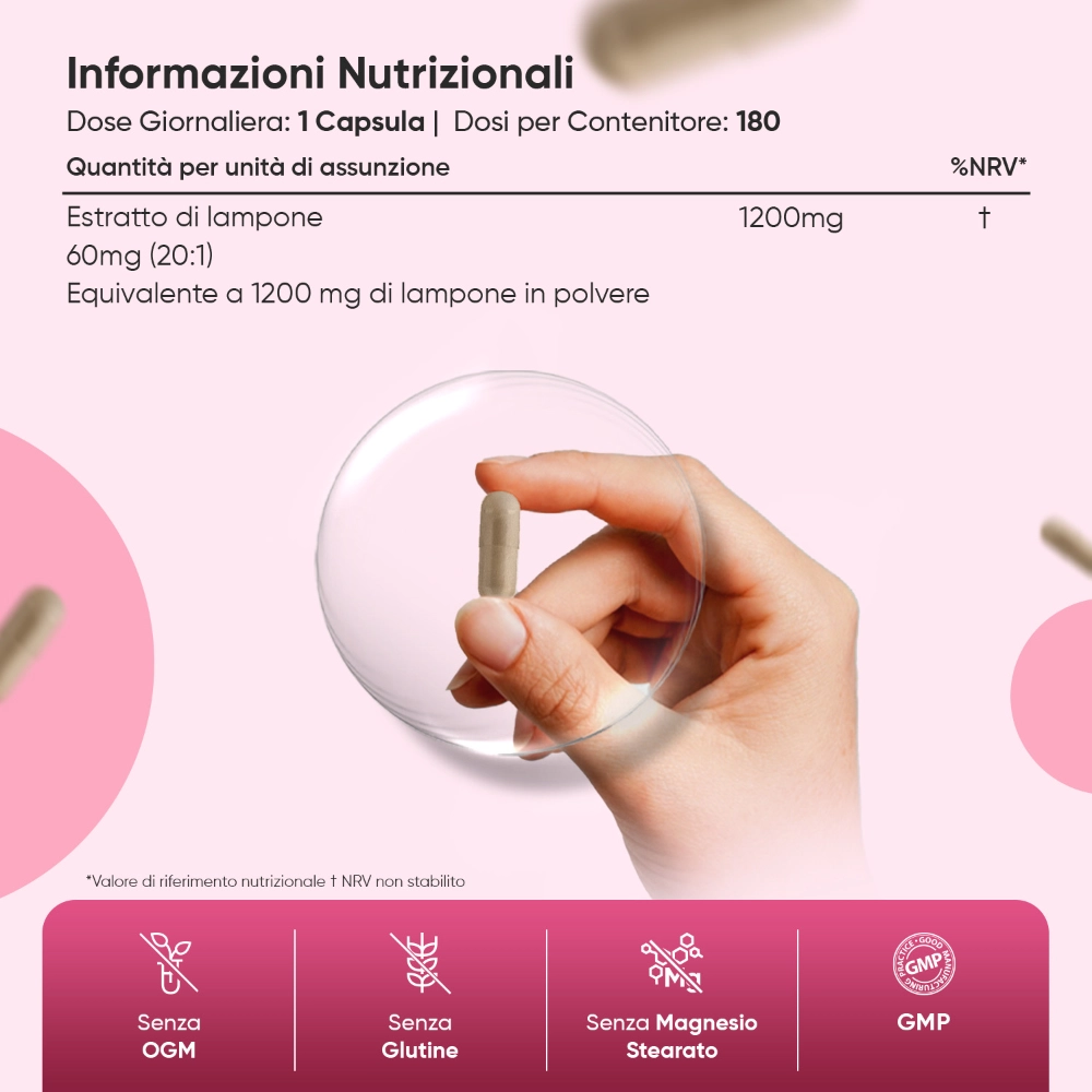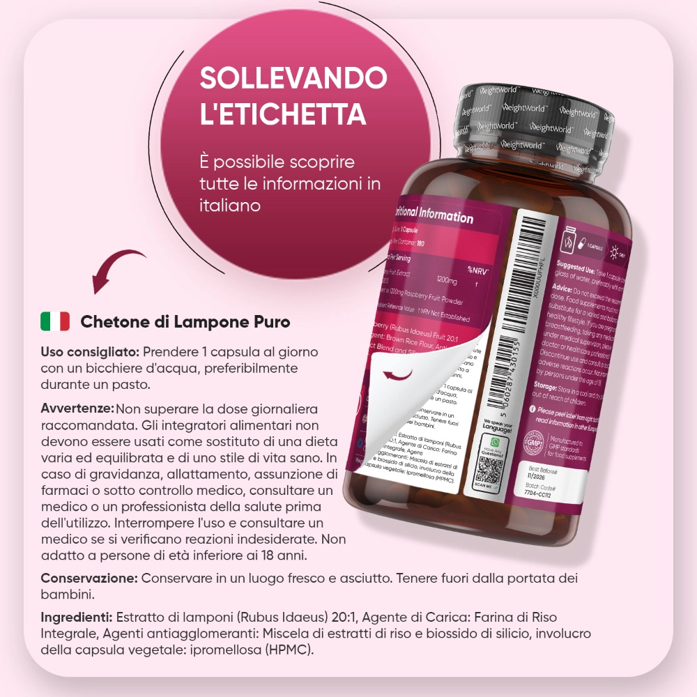 Raspberry Ketone Pure offre dosi giornaliere da 1200mg di Chetoni naturali di Lampone in capsule facili da ingerire e Vegan. Per beneficiare degli straordinari vantaggi dei Chetoni di Lampone basta assumere una capsula al giorno insieme ad un bicchiere d'acqua, preferibilmente durante un pasto. Ogni confezione contiene 180 capsule per una durata di 6 mesi di utilizzo.