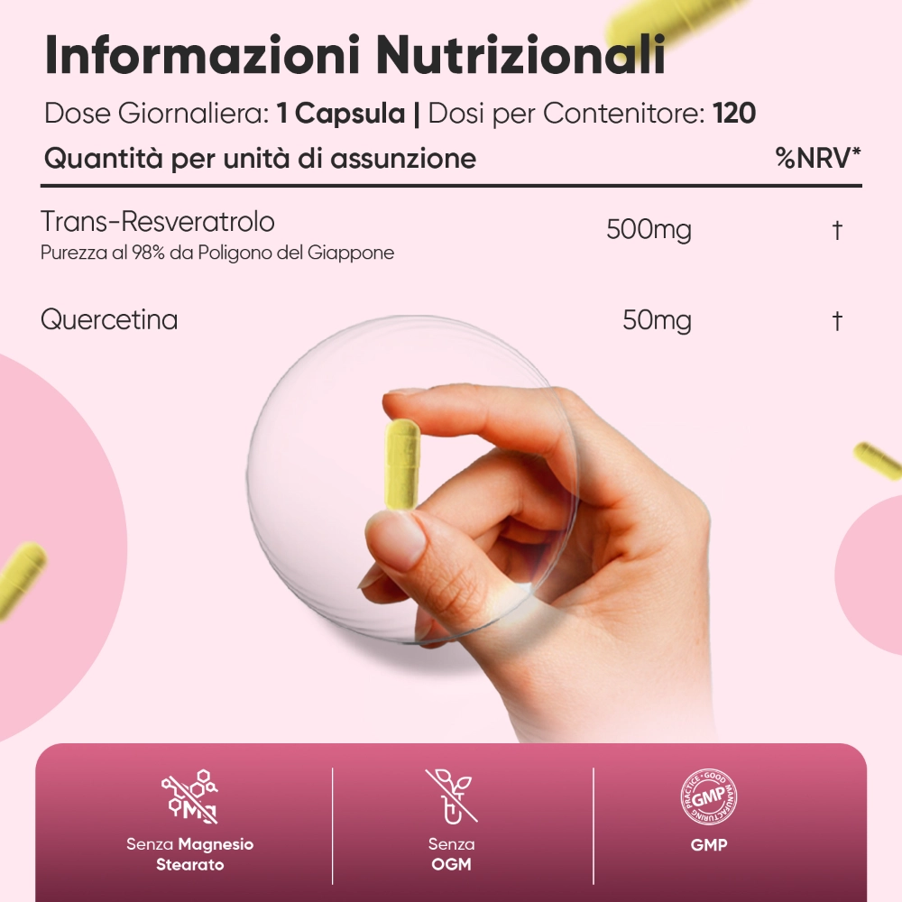 Il Resveratrolo è un composto polifenolico presente nell'uva rossa e lamponi ed è diventato molto popolare per via dei suoi benefici antiossidanti, che contrastano i danni provocati dai radicali liberi attenuando i segni dell'invecchiamento. Ogni assunzione giornaliera di due capsule fornisce un dosaggio di ben 500 mg di Resveratrolo puro al 100%. Inoltre, le nostre capsule sono facili da deglutire, sono altamente efficaci e hanno una biodisponibilità superiore che garantisce un assorbimento più rapido da parte dell'organismo e benefici maggiori.