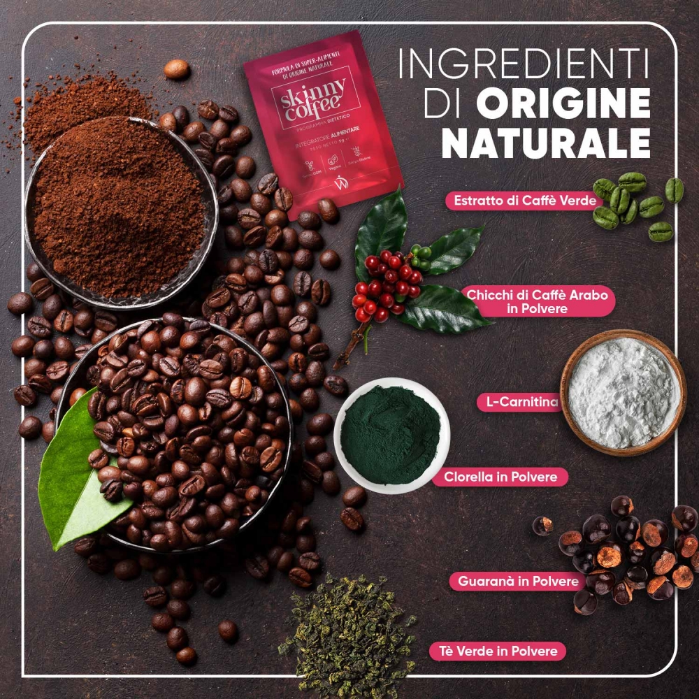 Cosa c’è esattamente in Skinny Coffee? Oltre ai chicchi selezionati di caffè arabo, ogni confezione è arricchita con i migliori superfood indicati per la gestione del peso e per il benessere generale tra cui: