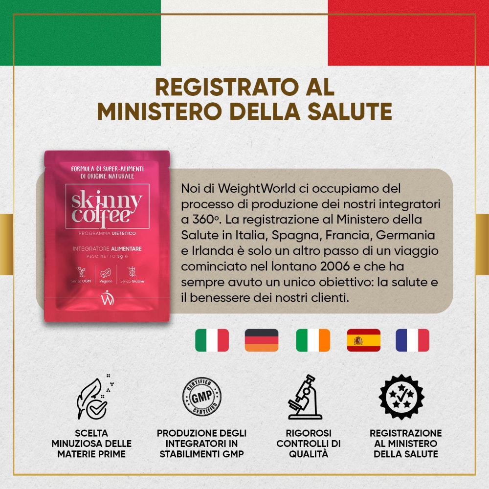 Skinny Coffee non è un prodotto miracoloso. Tuttavia, se usato correttamente, può essere un ottimo aiuto per la tua dieta, oltre a prendersi cura della tua salute generale. Per ottenere migliori risultati, il tuo caffè deve essere accompagnato da una dieta equilibrata e da un regolare esercizio fisico. Questo prodotto è realizzato con ingredienti biologici e naturali e quindi non ha effetti collaterali noti ed è sicuro da usare. Ti consigliamo comunque di leggere la lista completa degli ingredienti per verificare l’eventuale presenza di allergeni. Questa bevanda dimagrante non è adatta a chi ha meno di 18 anni o alle donne in gravidanza o in allattamento.