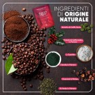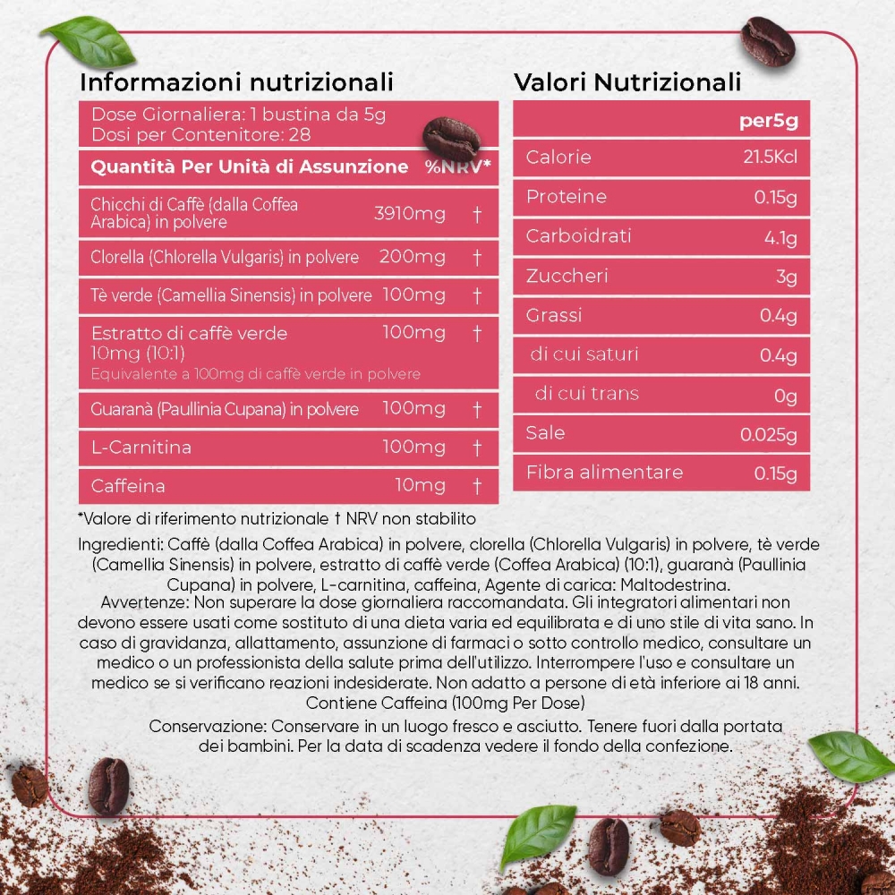 Elenco completo degli ingredienti: Caffè (dalla Coffea Arabica) in polvere, clorella (Chlorella Vulgaris) in polvere, tè verde (Camellia Sinensis) in polvere, estratto di caffè verde (Coffea Arabica) (10:1), guaranà (Paullinia Cupana) in polvere, L-carnitina, caffeina, Agente di carica: Maltodestrina.