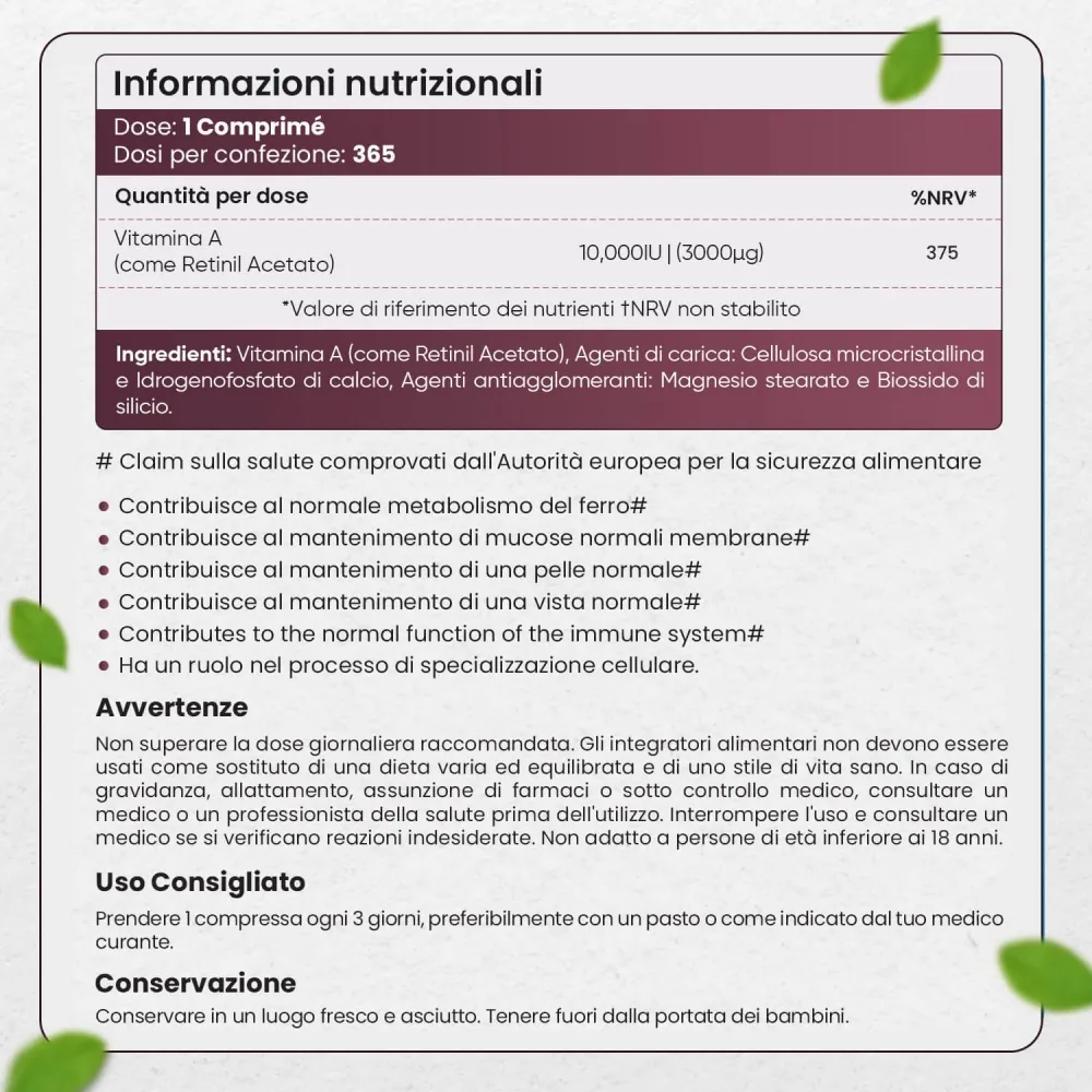 Ogni paese dell'UE ha le proprie dosi giornaliere di vitamina A, leggere attentamente le istruzioni sull'etichetta prima di utilizzare questo prodotto.