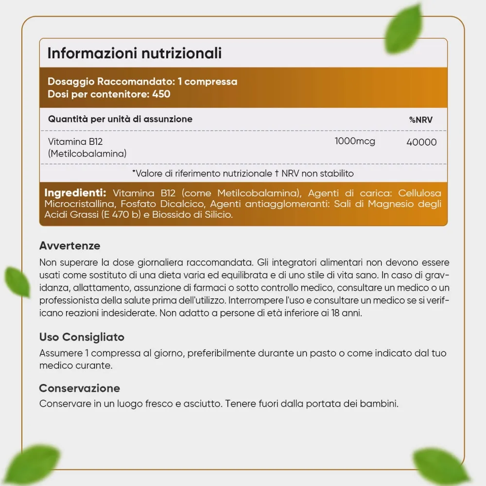 1000 mcg 450 Compresse | Metilcobalamina Pura B12