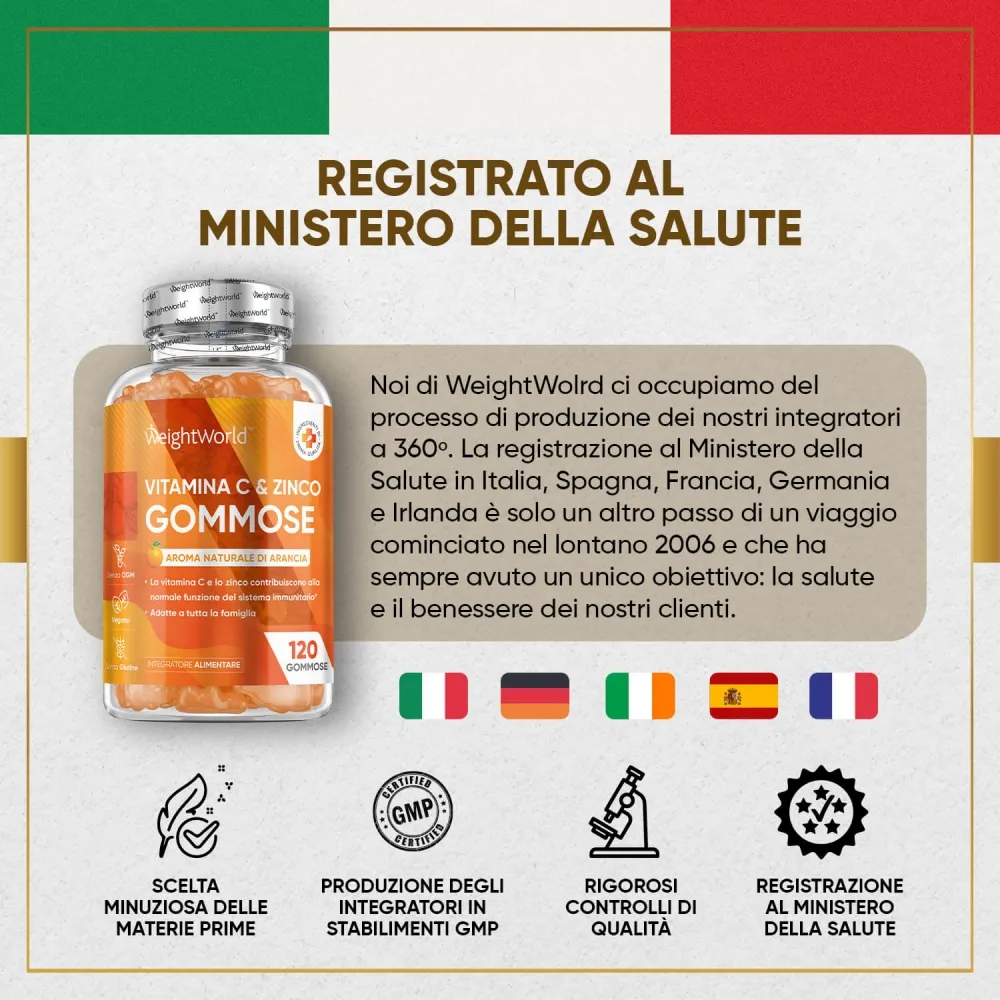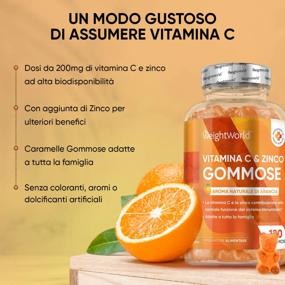 Le Gomme Vitamina C di WeightWorld sono sviluppate per aiutarti ad assumere la giusta dose di Vitamina C ogni giorno e prenderti cura del tuo corpo in modo gustoso. Provale e non potrai più farne a meno!