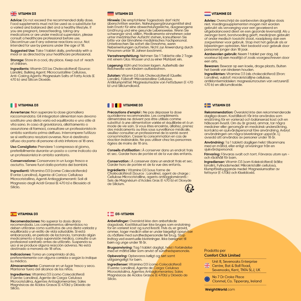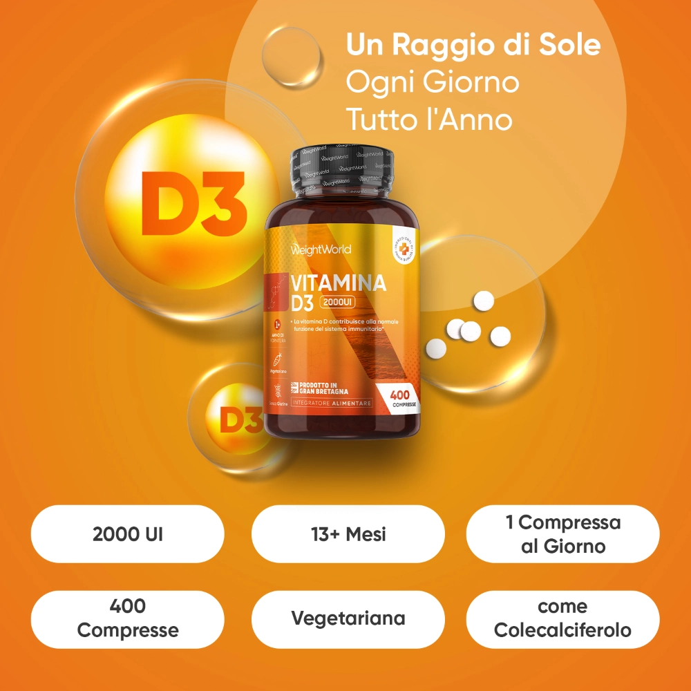 Le compresse di vitamina D3 ad alta concentrazione di 2000 UI di WeightWorld sono una potente fonte di colecalciferolo biodisponibile, per un alto assorbimento e un dosaggio ottimale. Così potrai sfruttare al meglio la potenza della vitamina D, che ha un ruolo nel processo di divisione cellulare e contribuisce anche a: