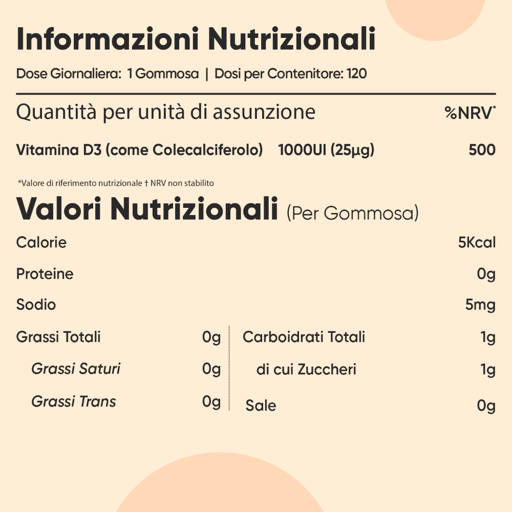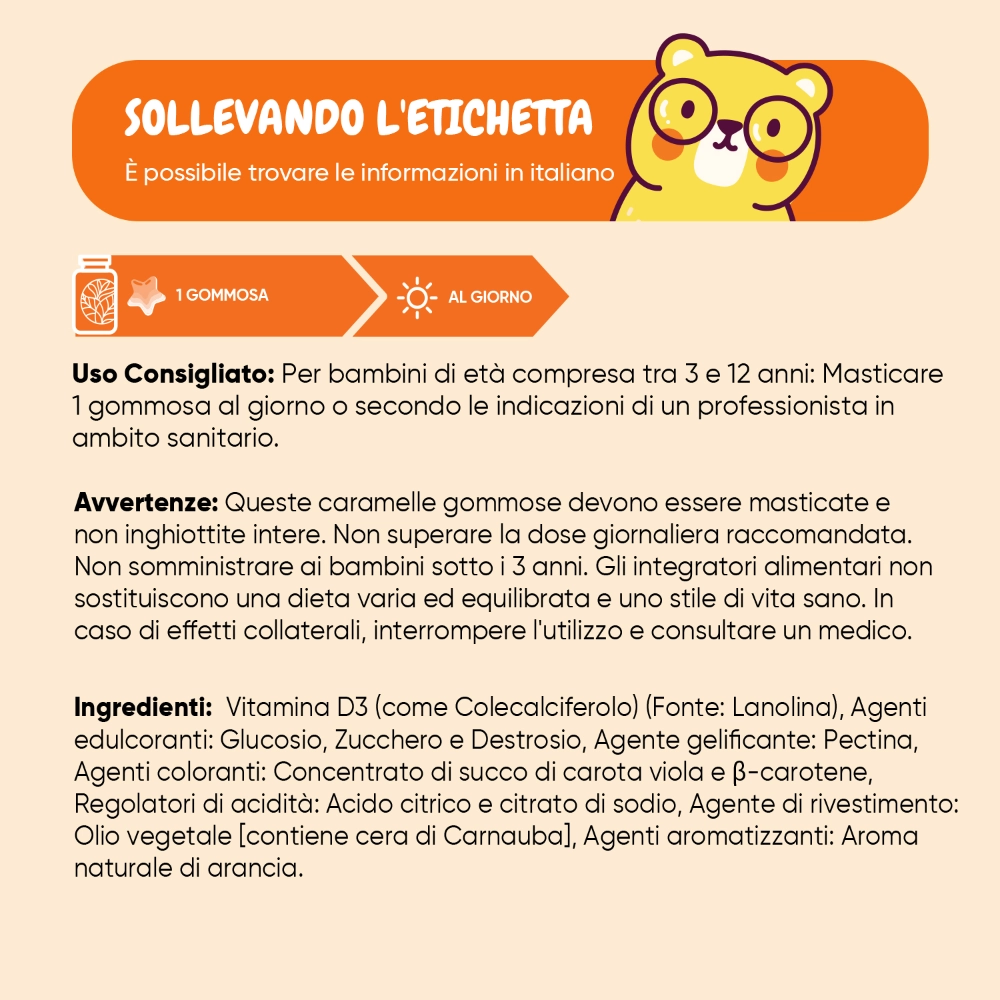 Le nostre caramelle gommose alla Vitamina D3 sono sviluppate per aiutarti a garantire ai tuoi piccoli il giusto apporto di Vitamina e supportare la loro crescita e il loro sistema immunitario. A volte può essere difficile convincere i più piccoli a prendere vitamine in capsule, per questo le nostre caramelle hanno un delizioso sapore di arancia che le rende perfette da aggiungere alla colazione o alla merenda dei più piccoli. Ogni confezione contiene 120 caramelle per 4 mesi di utilizzo e hai diritto alla nostra Garanzia Soddisfatti o Rimborsati. Provale subito!