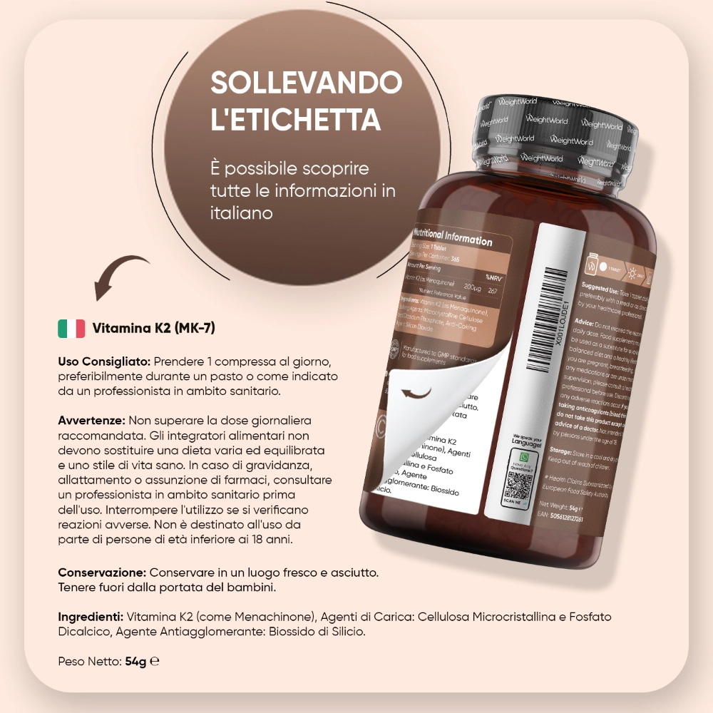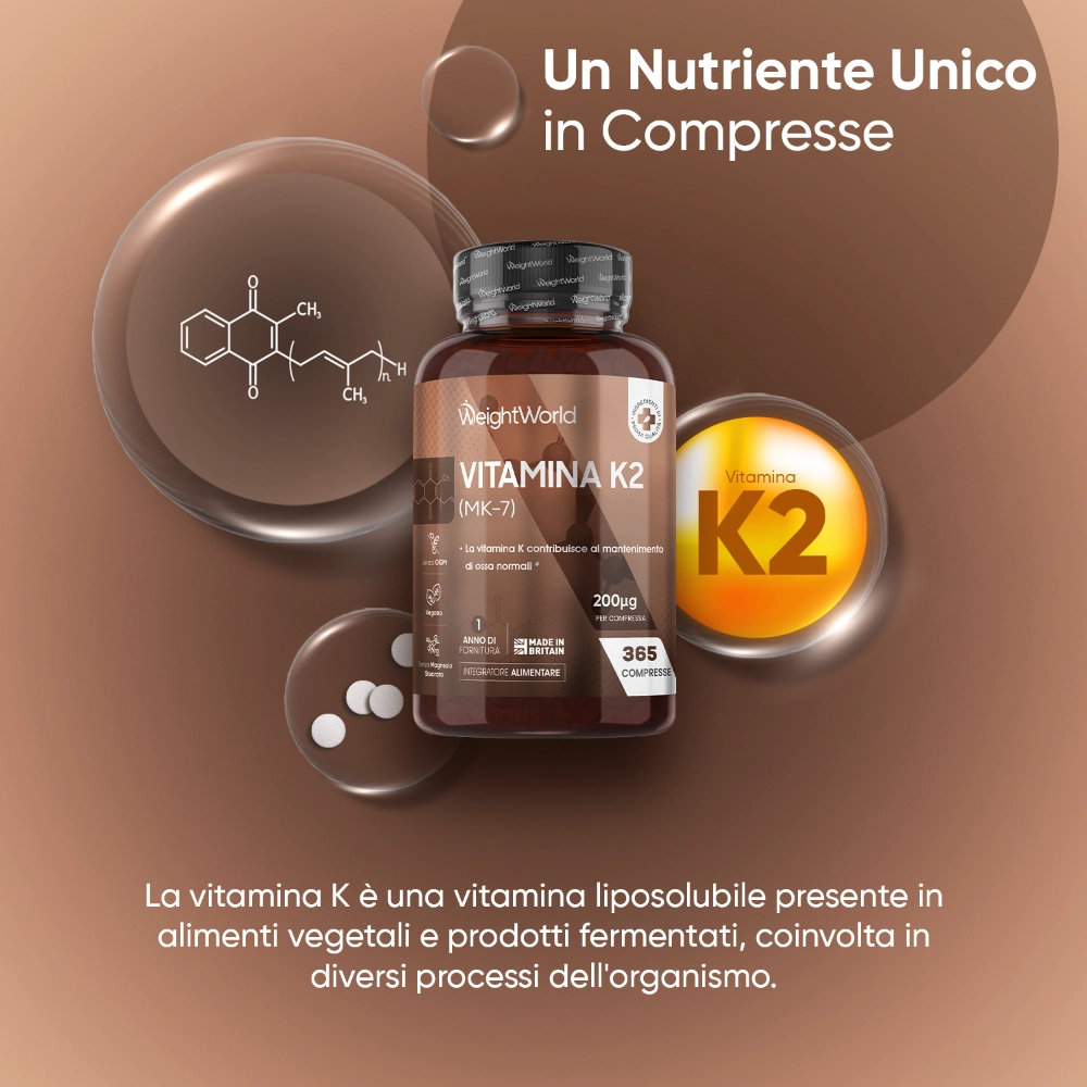 La Vitamina K2 è diventata popolare tra le persone per il suo impatto positivo sul mantenimento della normale vitalità e benessere. Si trova di solito in due diverse forme negli integratori alimentari: MK4 (sintetico) e MK7 (naturale). La Vitamina MK7 è più biodisponibile (altamente assorbibile) e ha un'emivita più lunga, quindi una dose minore può dare maggiori benefici al tuo corpo. Le compresse di Vitamina K2 di WeightWorld ti offrono una dose ottimale di Menachinone (MK7) per fornirti tutti i vantaggi di K2, come: