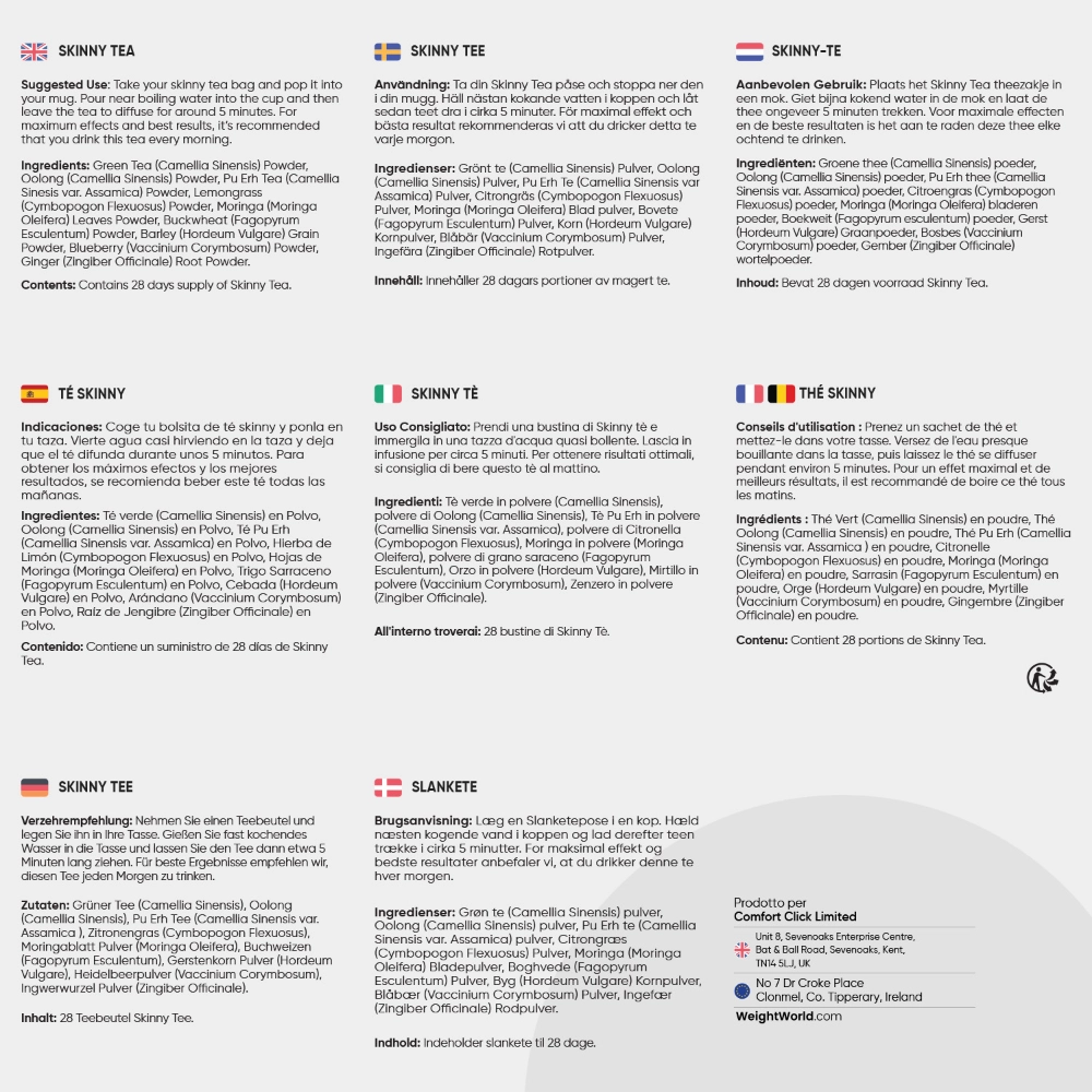 Ciò che rende eccezionale questa combinazione di tè non è solo l’essere un modo gustoso e divertente per restare in forma, ma la vasta gamma di potenti ingredienti naturali che possono offrire incredibili benefici al nostro corpo, uniti insieme in pratiche bustine di tè, in modo da farti affrontare con gusto i tuoi percorsi di dimagrimento e di benessere.