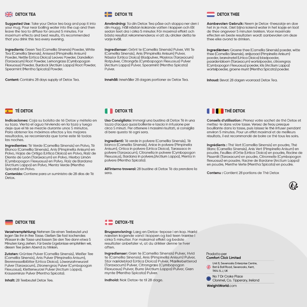 Un modo divertente e delizioso per prendersi cura del proprio corpo: l'assortimento di tè WeightWorld offre tutto il necessario per aiutarti a purificare il corpo e a tenere sotto controllo il peso. Contiene il tè disintossicante e il tè dimagrante, una combinazione pensata per un programma completo di 28 giorni che prevede tè mattutini e serali per soddisfare le esigenze specifiche del corpo in ogni momento della giornata.
